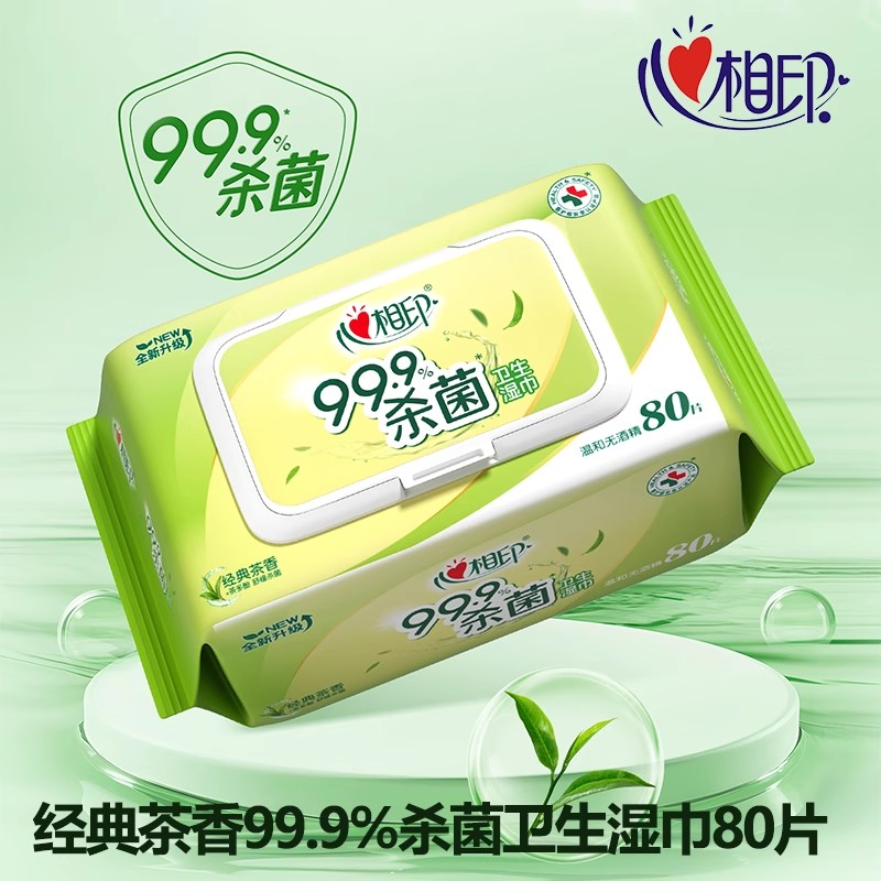 心相印杀菌湿巾经典茶香家用实惠大包装湿纸巾清洁无酒精80抽6包