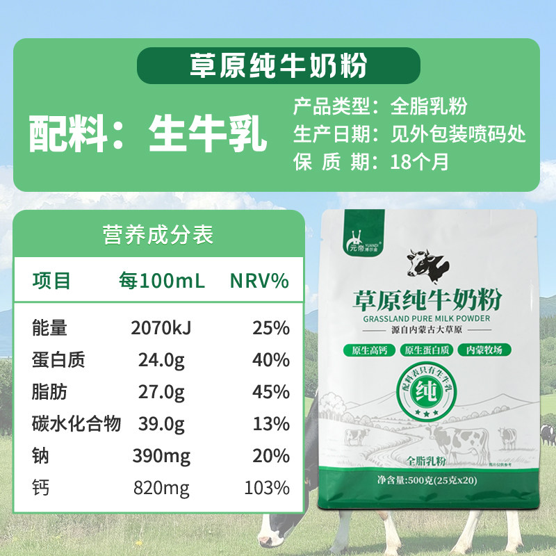 内蒙古高钙纯牛奶粉正品官方旗舰店1000克独立包装成人中老年学生