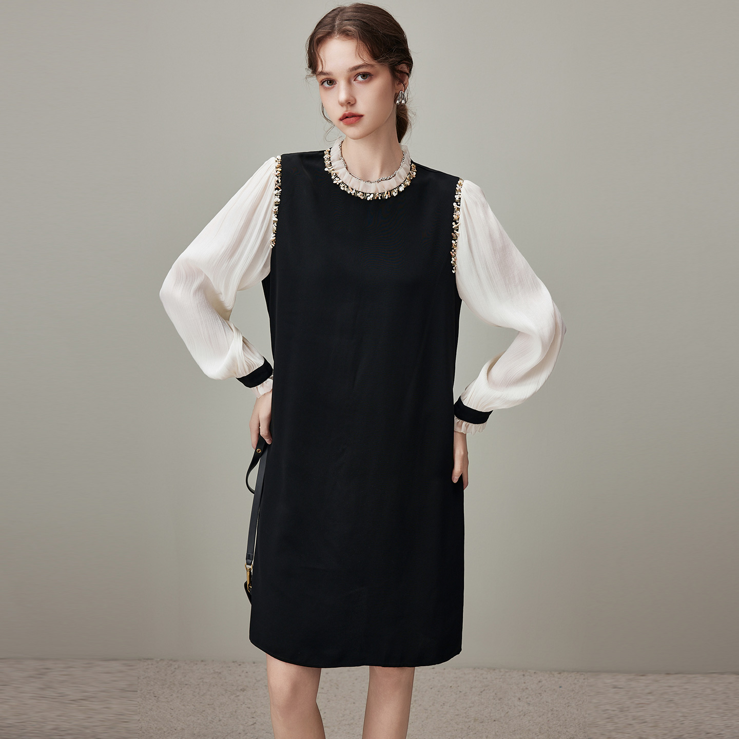 dfvc气质撞色拼接长袖连衣裙女2025年秋季新款小个子显瘦直筒裙子