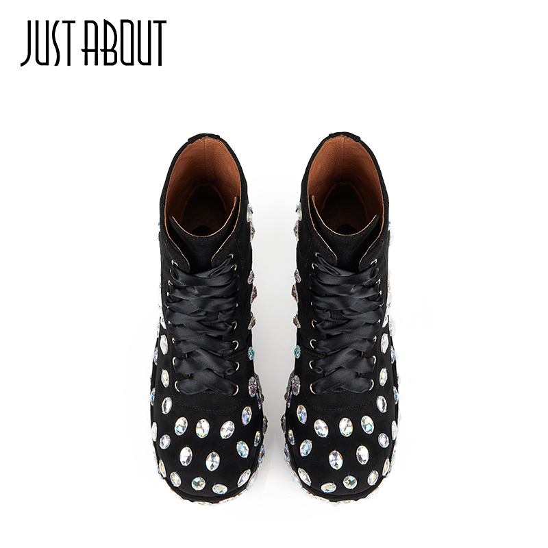 just about春季新款水晶圆头黑色防水台粗高跟靴时尚短靴马丁靴女