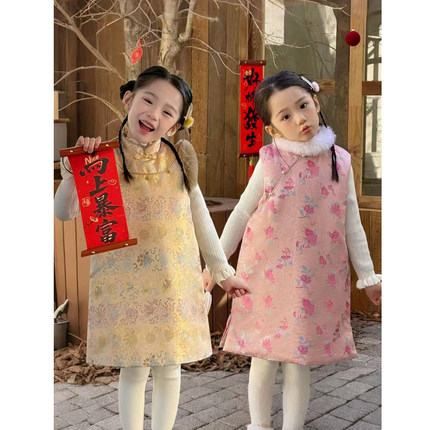 YFY冬季女童云锦逐鲤夹棉旗袍裙连衣裙背心裙新中式