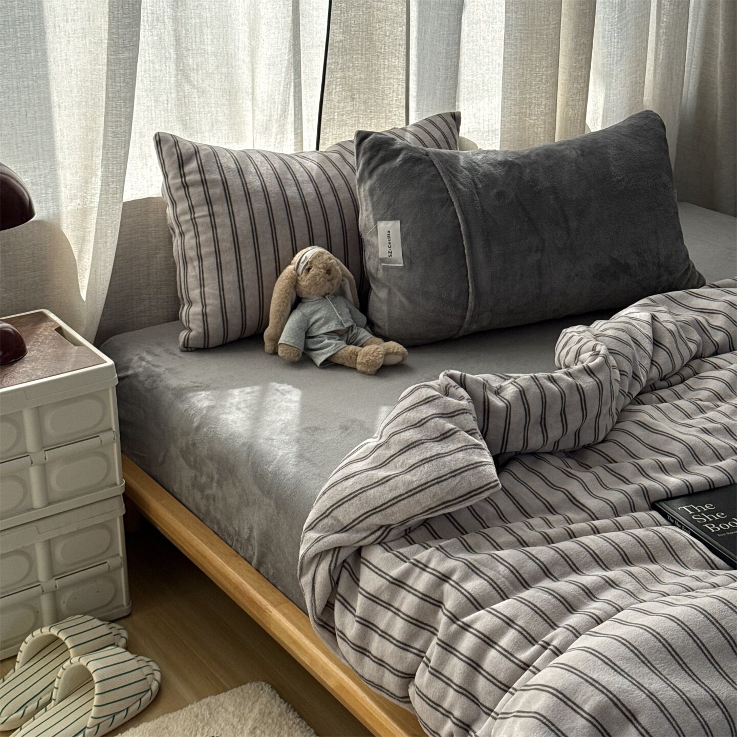 日式简约ins灰色条纹牛奶绒四件套冬天珊瑚绒法兰绒三件套床笠1.8