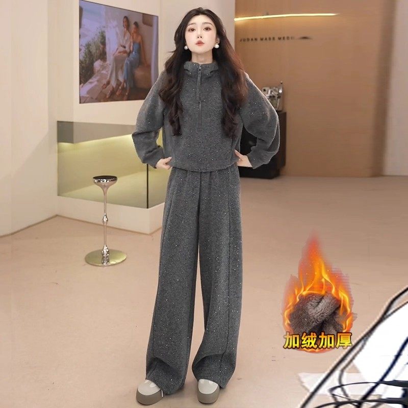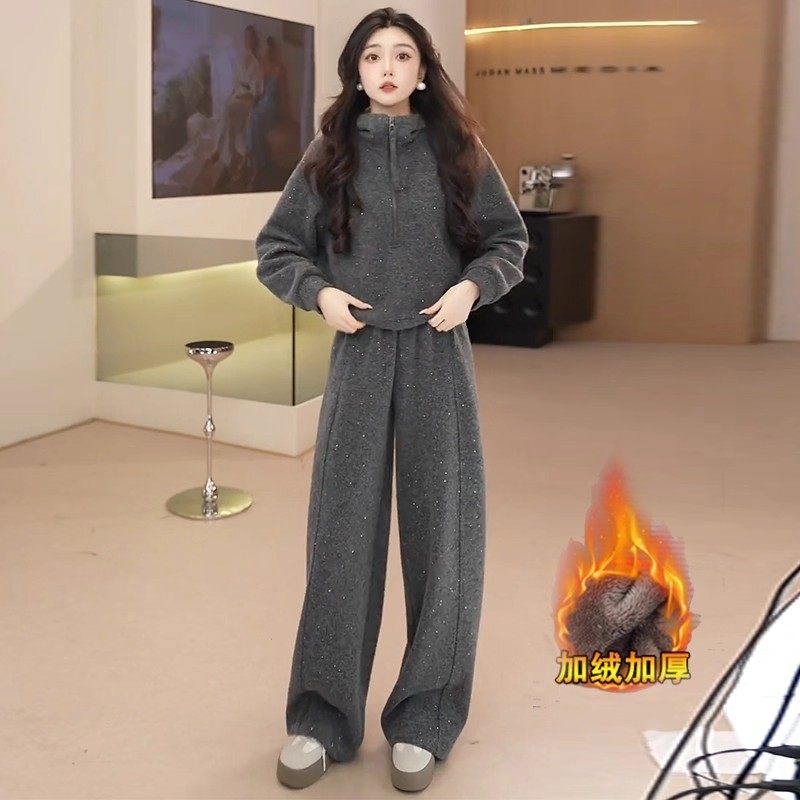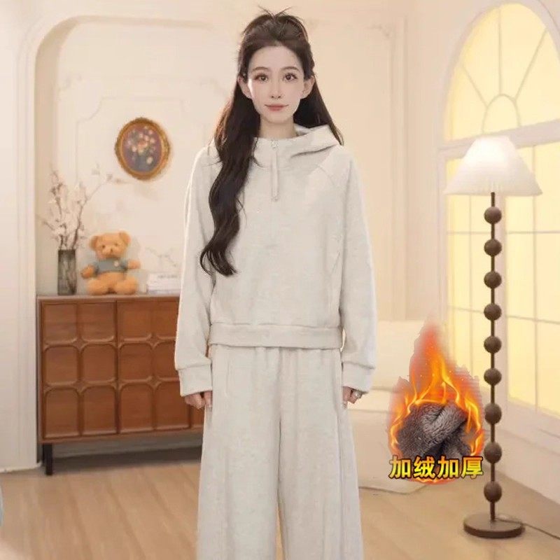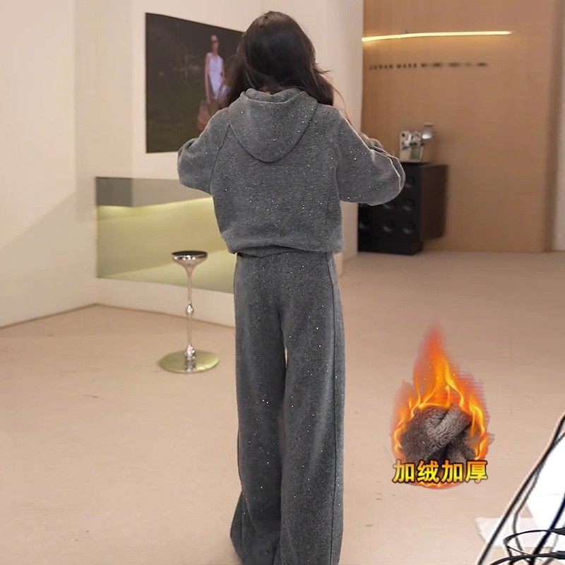 加绒加厚灰色运动服套装女冬季2025新款休闲连帽卫衣阔腿裤两件套