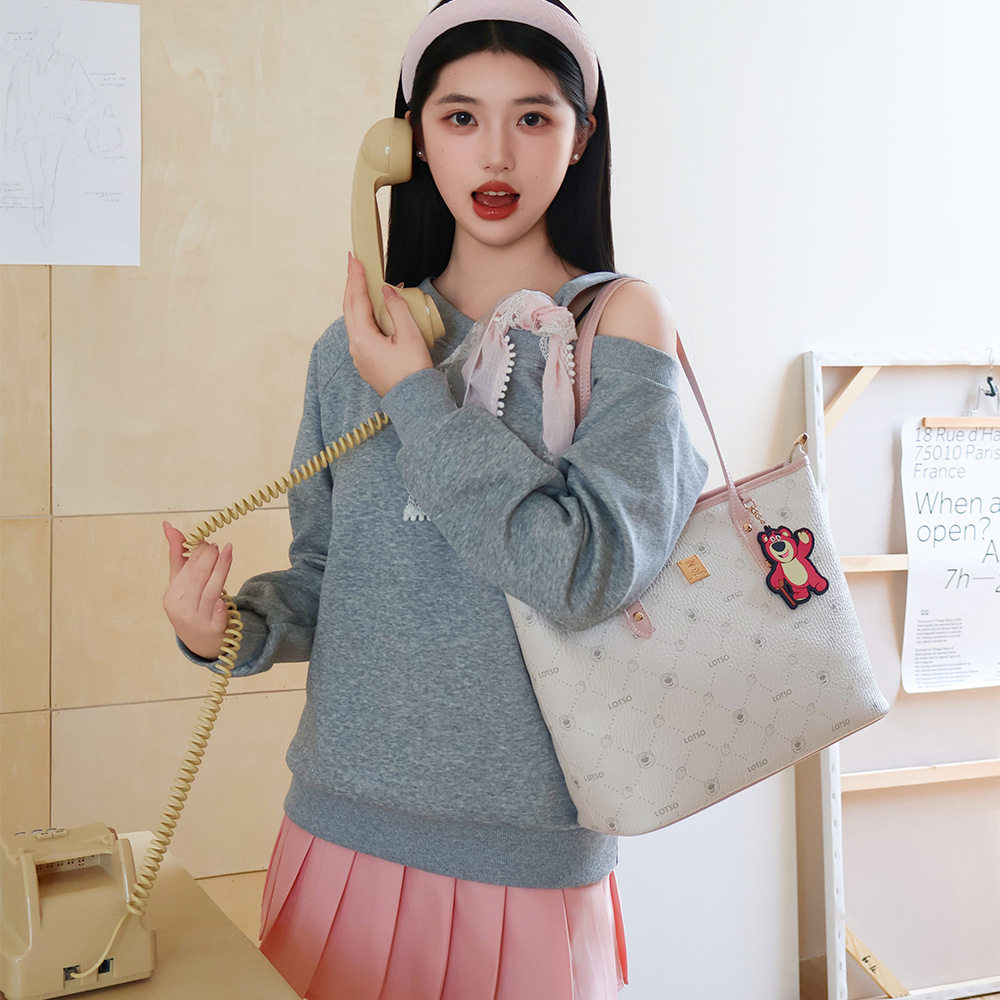 迪士尼少女肩挎包腋挎皮包草莓熊托特包女士甜美大容量单肩手提包