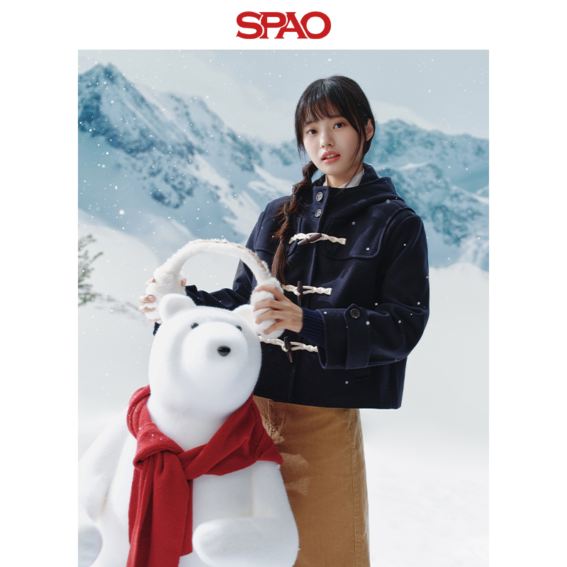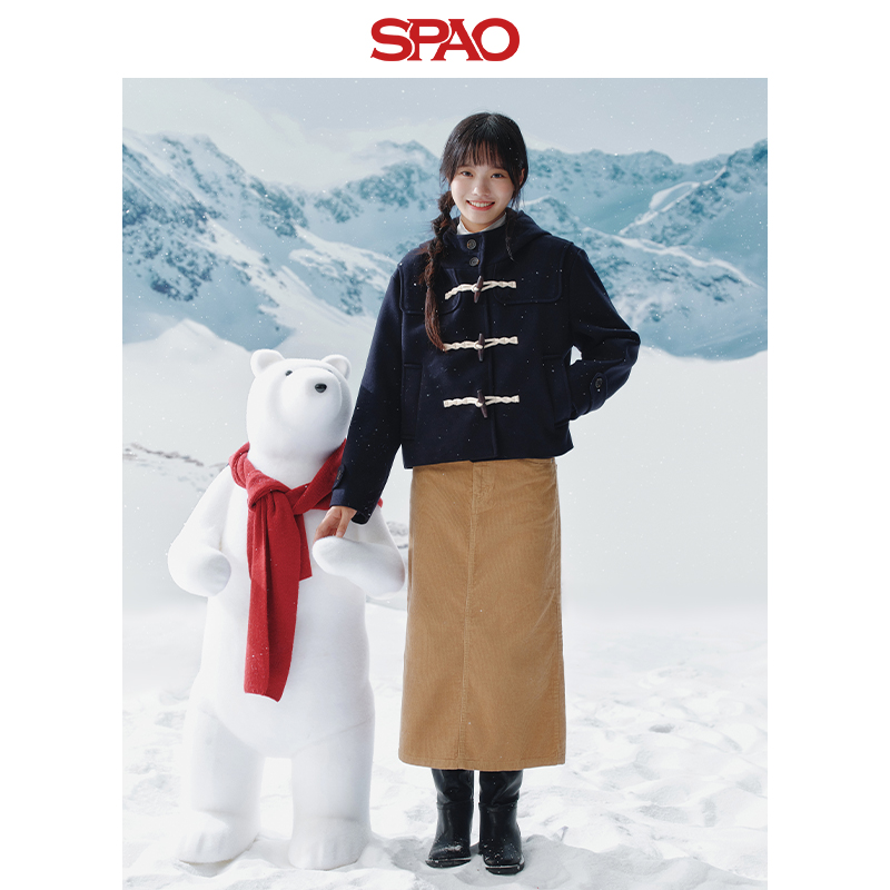 SPAO韩国同款秋冬女士时尚气质休闲短款牛角扣连帽毛呢外套