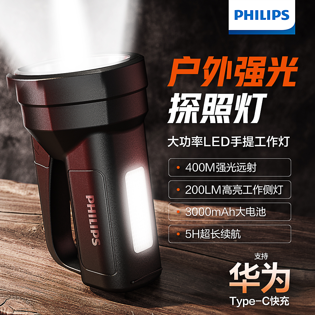 飞利浦手电筒强光充电户外超长续航大容量远射手提家用探照灯应急