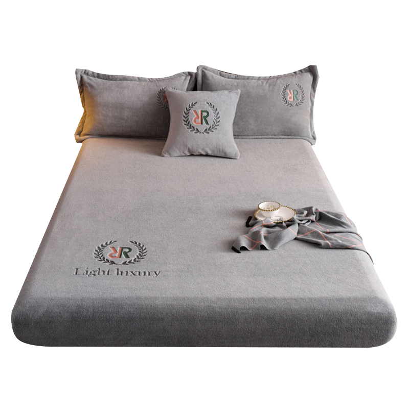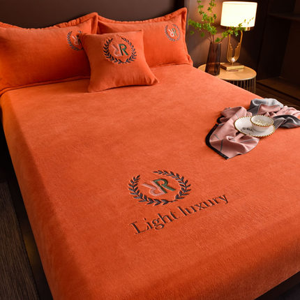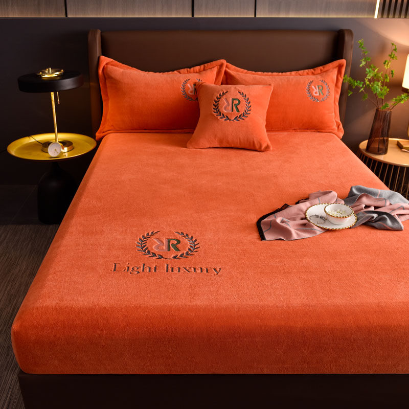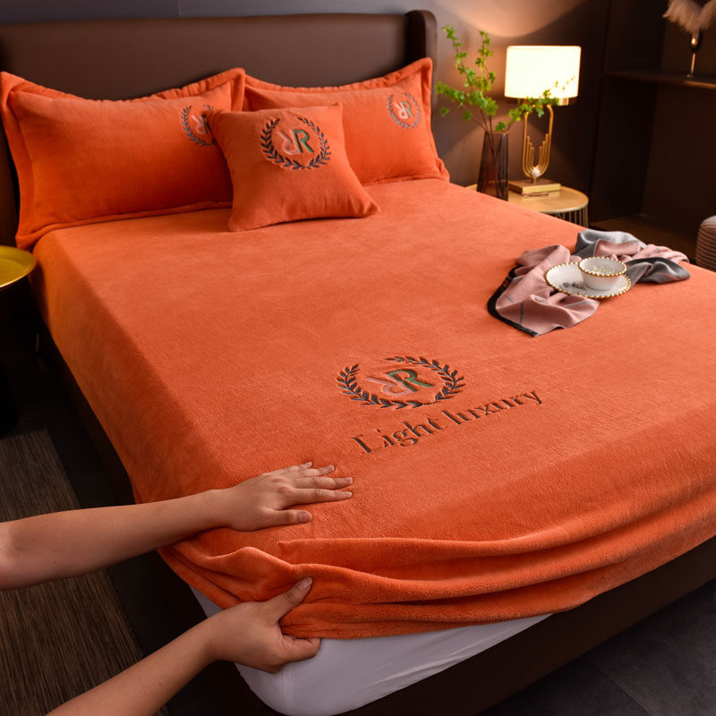 2021年新款高档刺绣牛奶绒床笠罩单件防滑橙色床单加厚床垫保护套