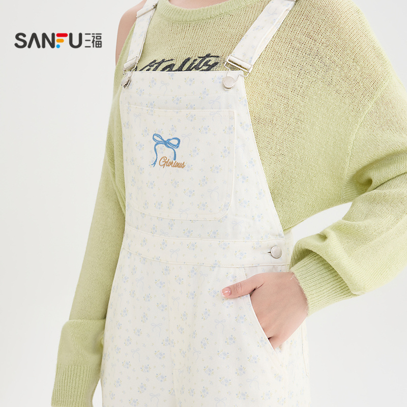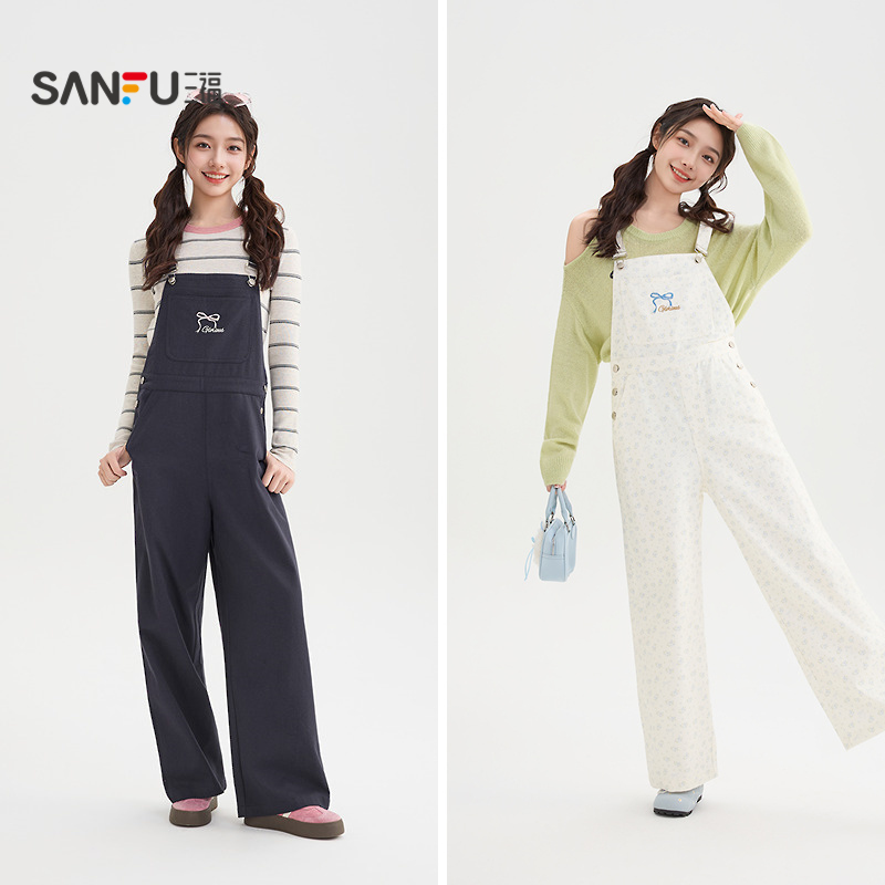 三福连身裤2025秋季蝴蝶结刺绣可调肩带连体裤背带裤女装509536