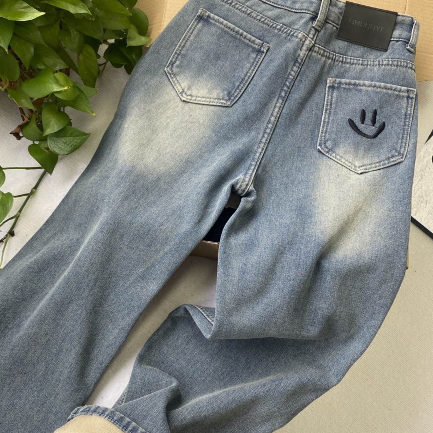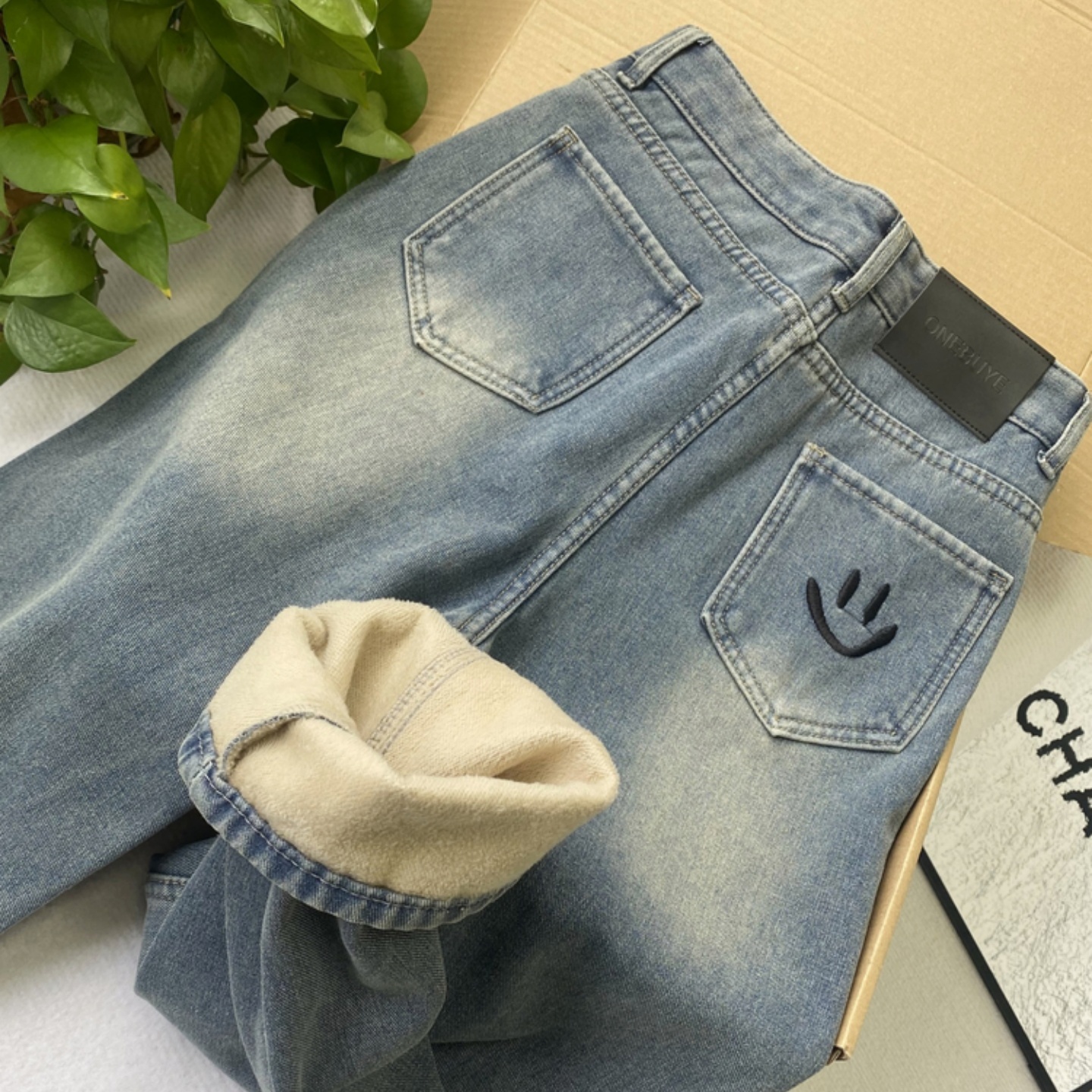 加绒加厚高腰牛仔裤女宽松直筒裤刺绣笑脸设计感窄版阔腿裤子冬季