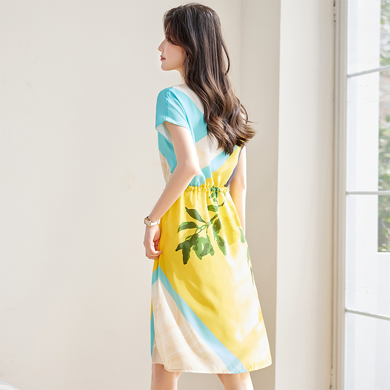 百依秀子淑女气质2025夏新款知性清新印花桑蚕丝真丝连衣裙B7185