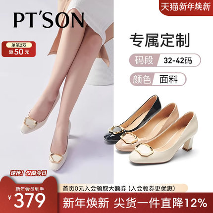 [定制小码32-33/大码40-42百田森粗跟单鞋真皮裸色高跟鞋大码女鞋