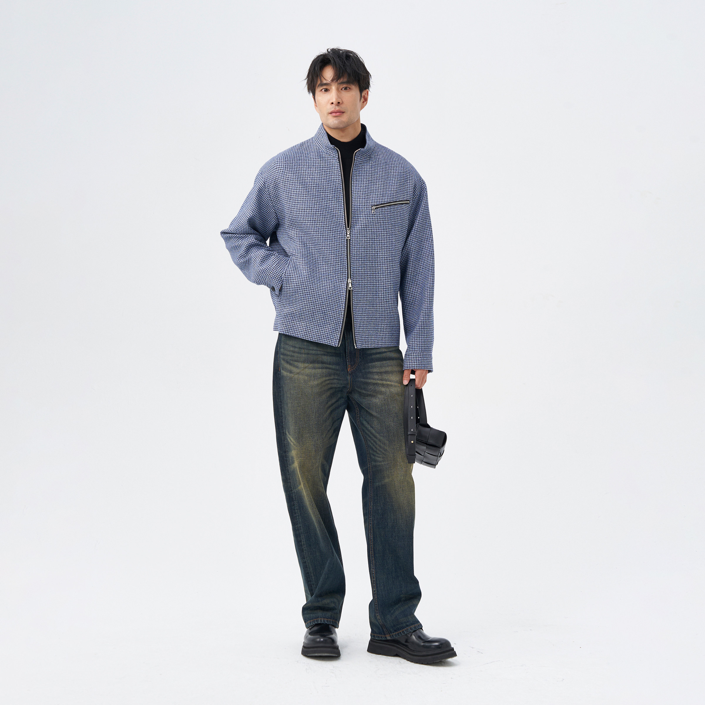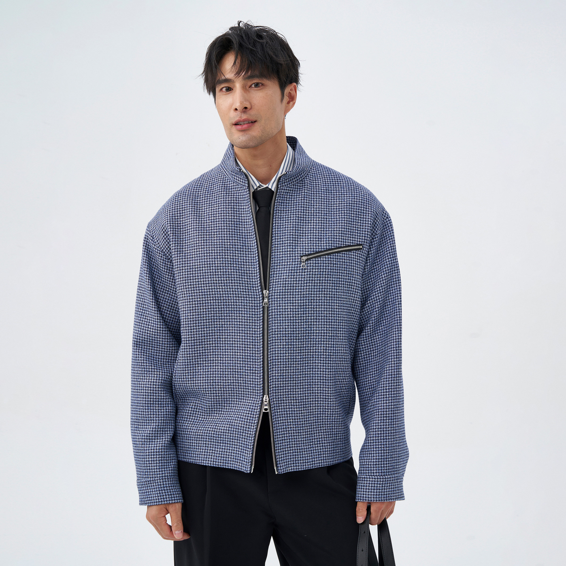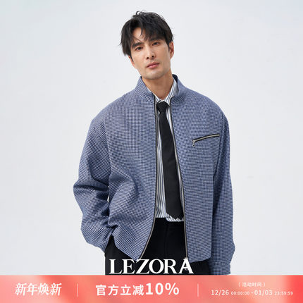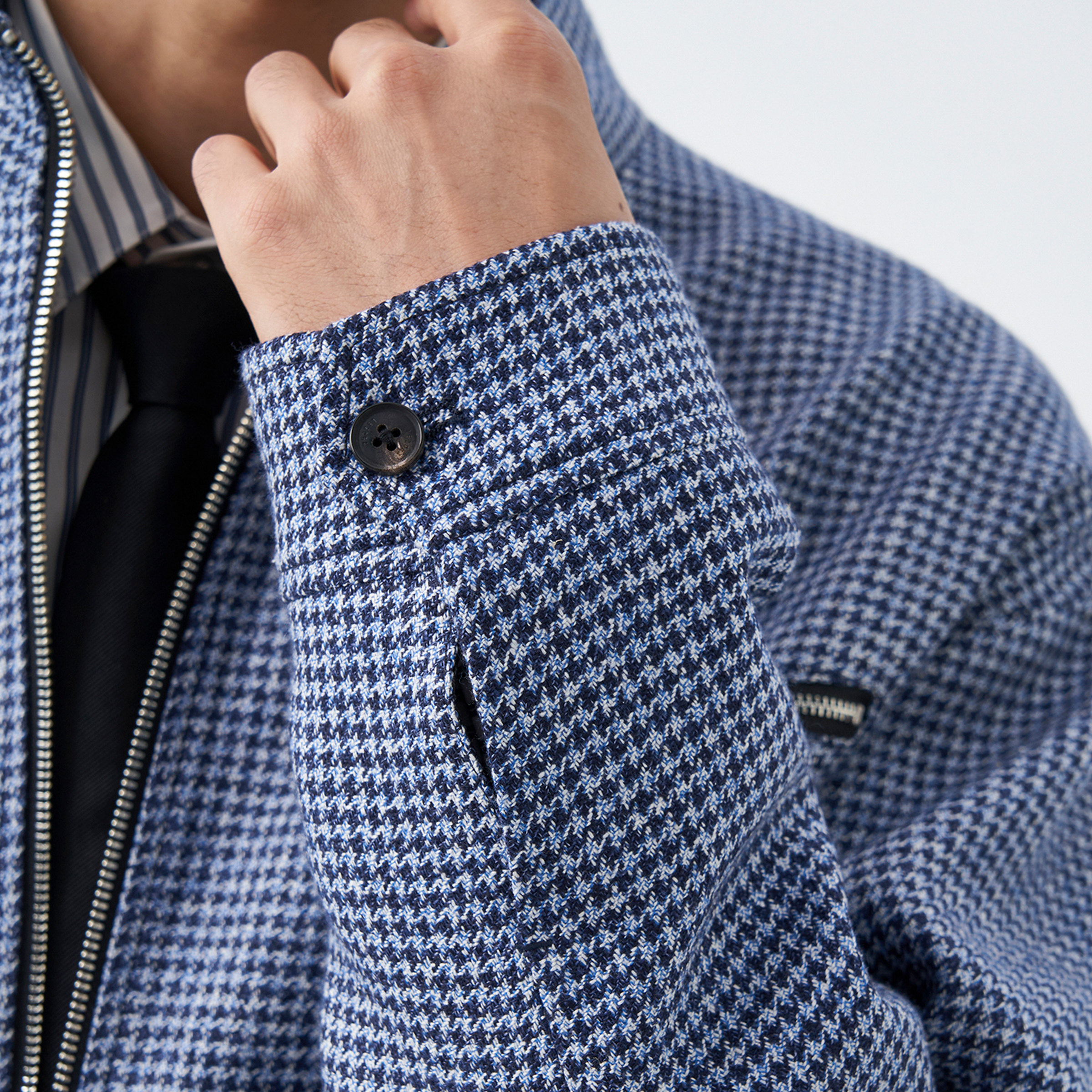 LEZORA英国产进口! 静奢真丝亚麻羊毛 蓝色千鸟格底特律夹克男秋