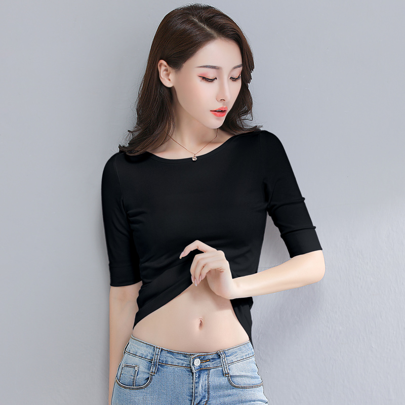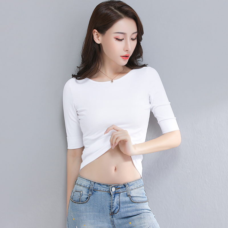 设计感中袖t恤女夏季百搭紧身打底衫七分袖短款体恤小众上衣早秋