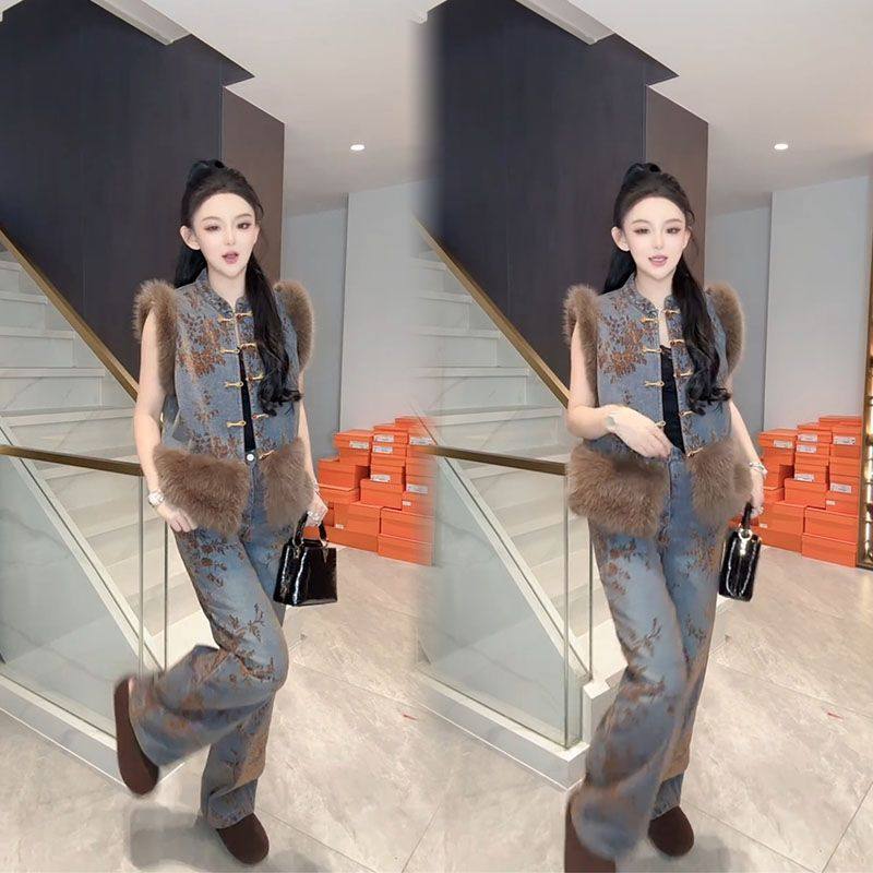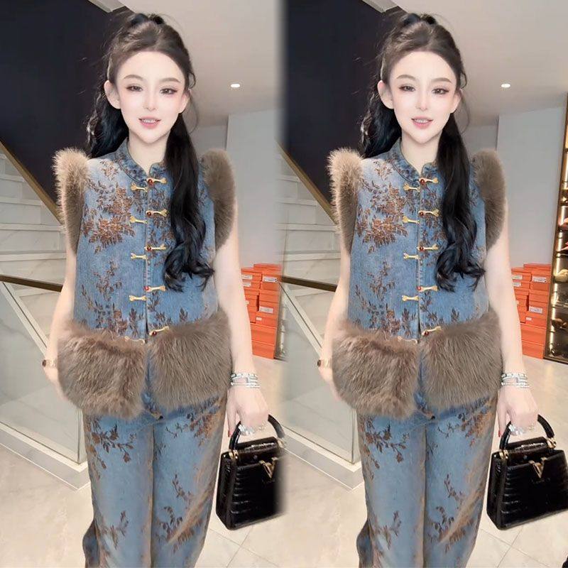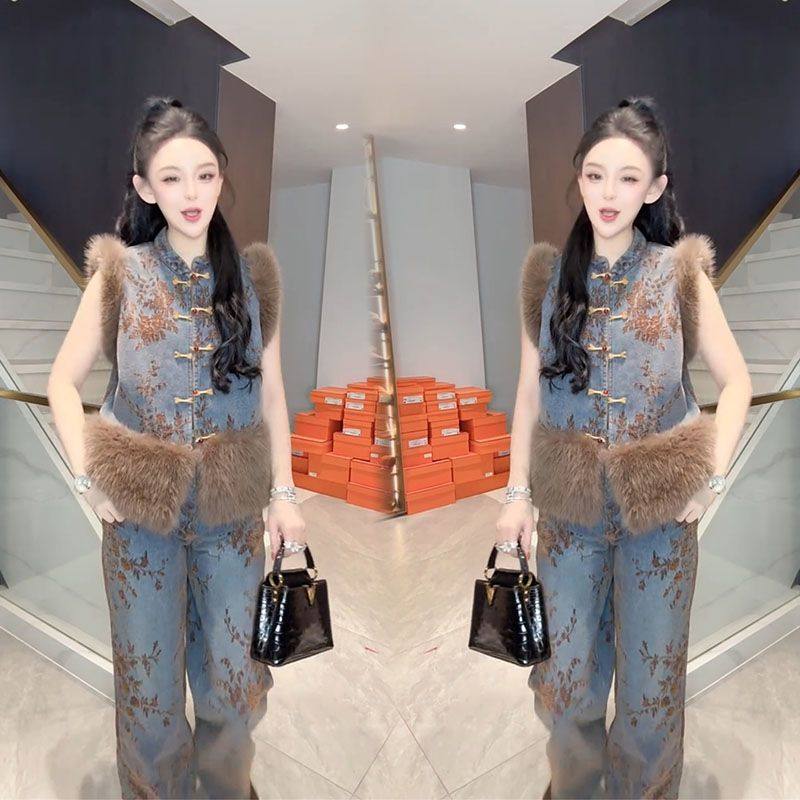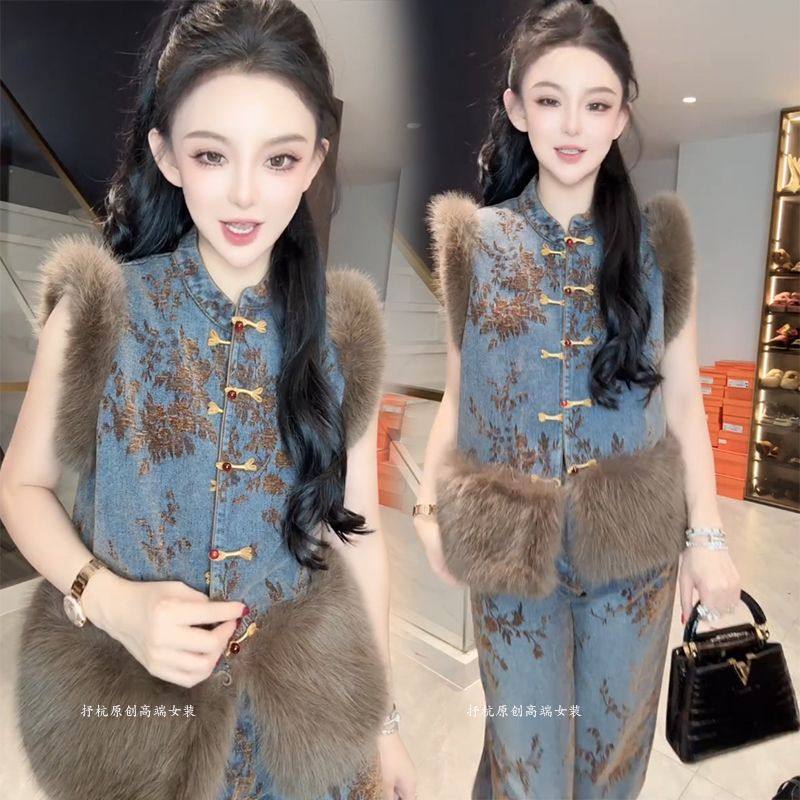 新中式国风套装2025冬气质名媛高级时尚盘扣提花马甲阔腿裤两件套