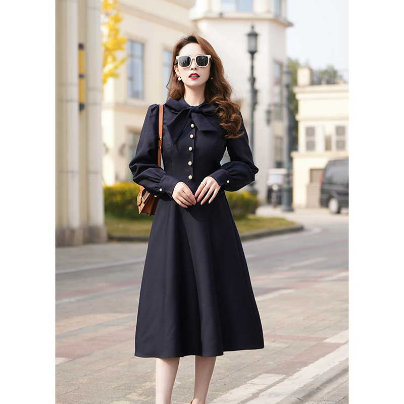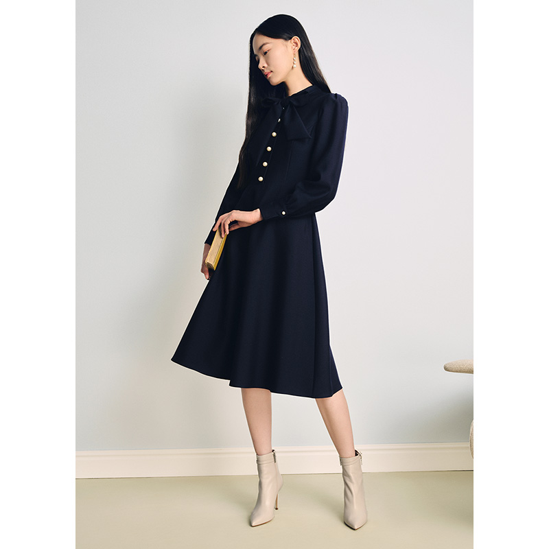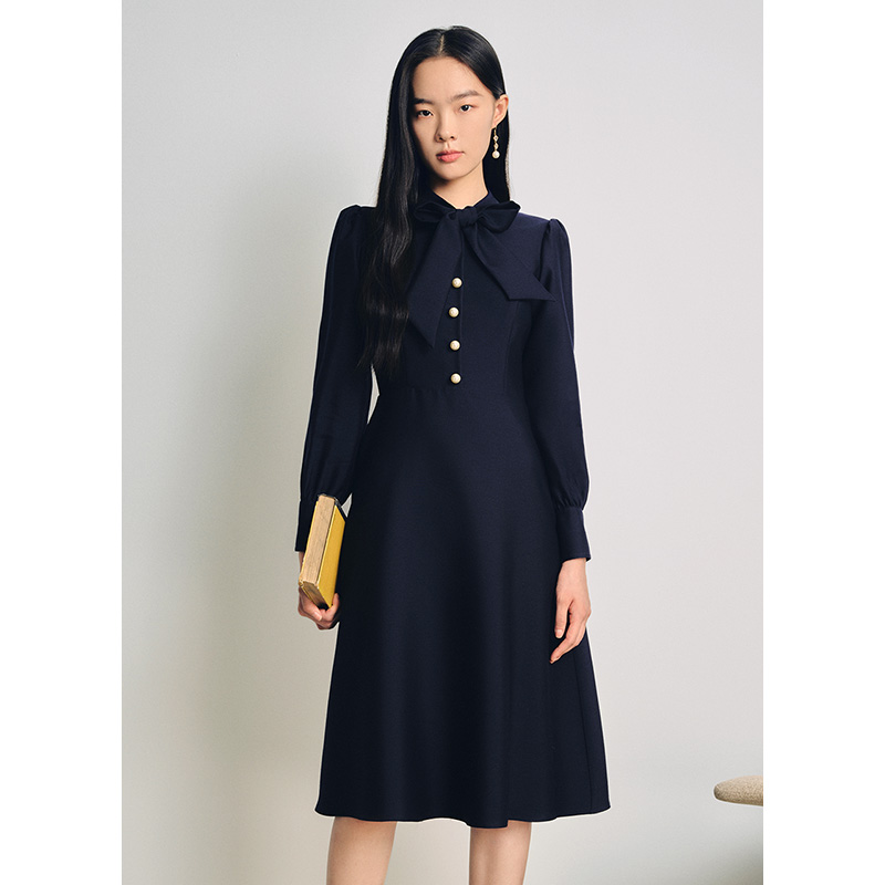lkbennett秋冬季法式连衣裙女23新款蝴蝶结收腰长裙蚕丝羊毛厚款