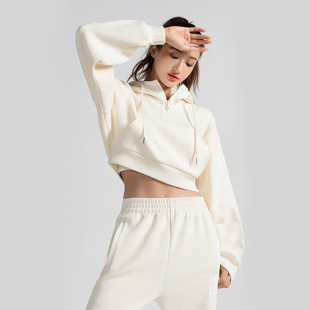 Monster Guardians 女子奶白色连帽卫衣短款针织宽松运动套装
