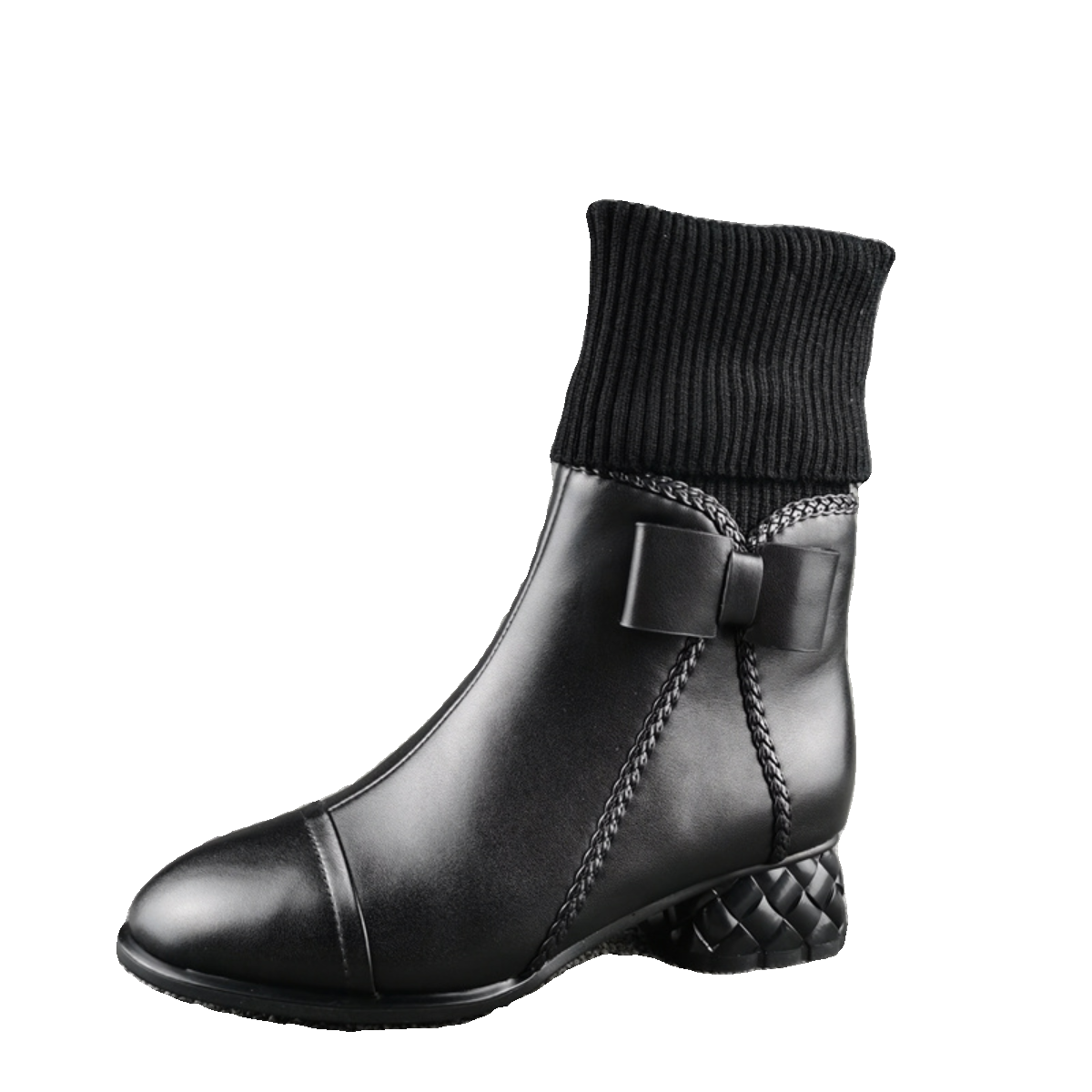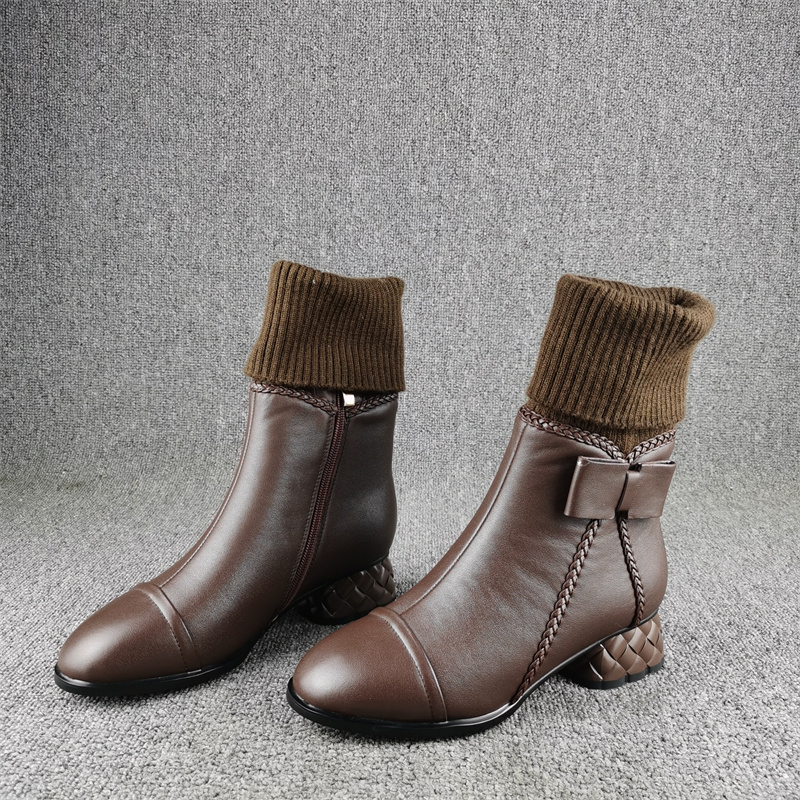 断码处理欧美风真皮时装靴女冬季圆头低跟牛皮加绒保暖短筒棉靴子
