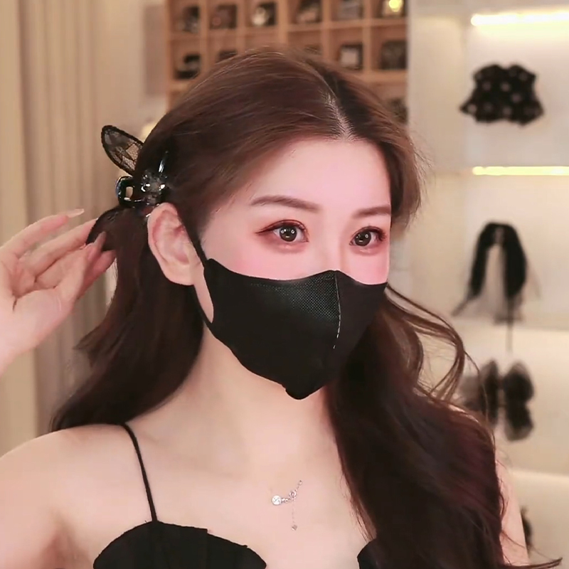 AB面水钻黑色蕾丝蝴蝶结小抓夹兔耳朵前额侧边发夹刘海边夹头饰女