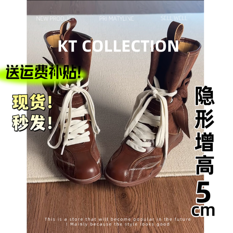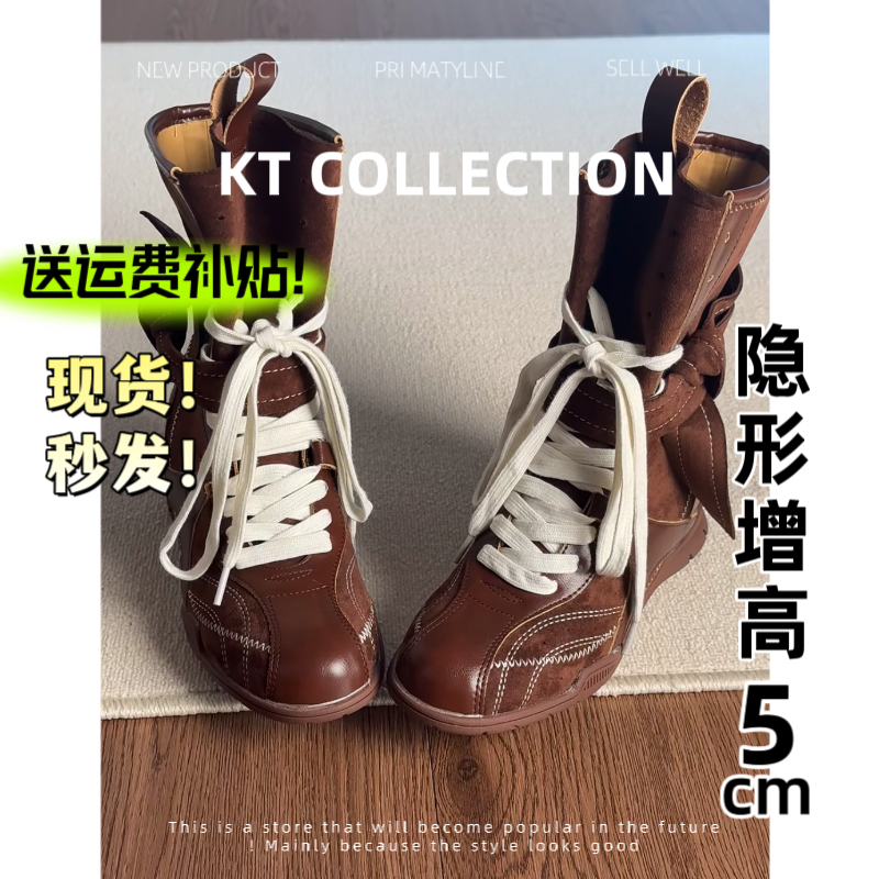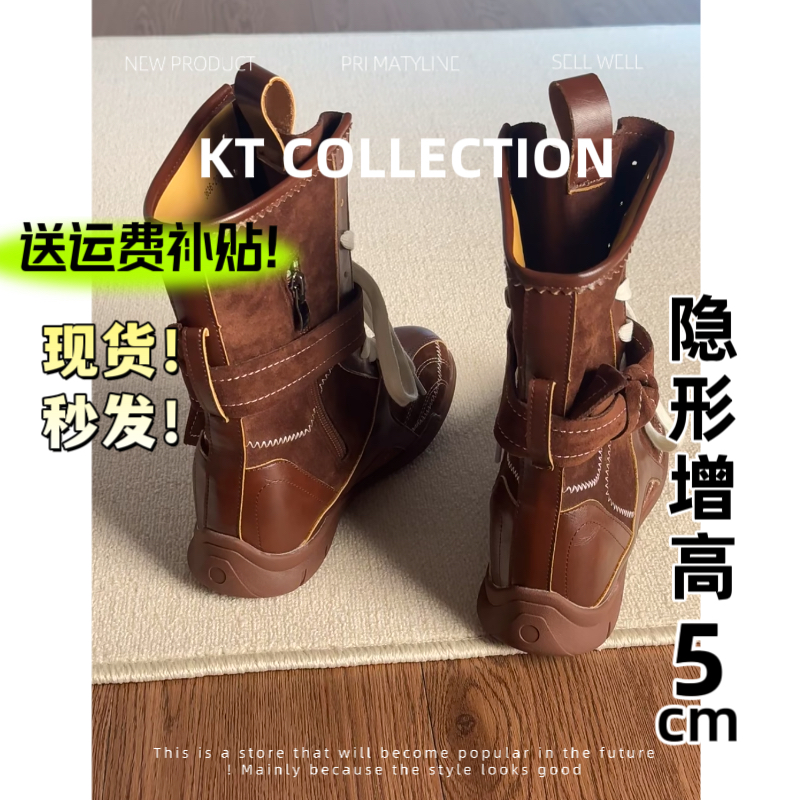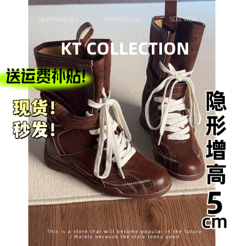 羊皮版!隐形内增高5cm~法式复古风圆头系带短靴女马丁靴拳击靴