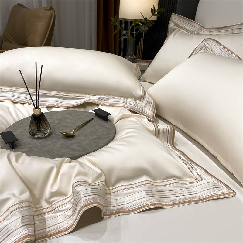 轻奢风210支长绒棉纯棉四件套简约刺绣纯色被套床单全棉床上用品