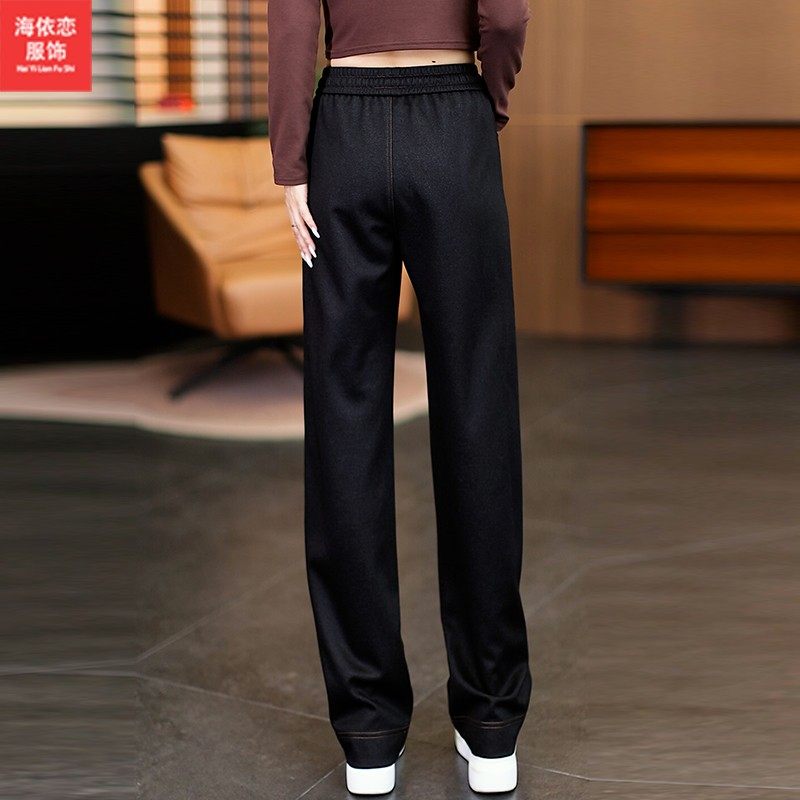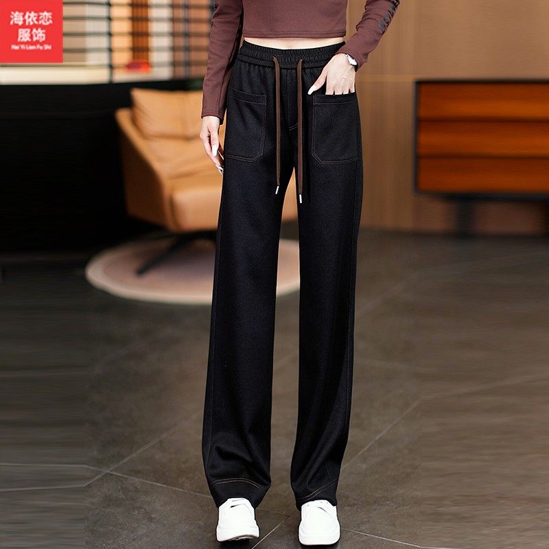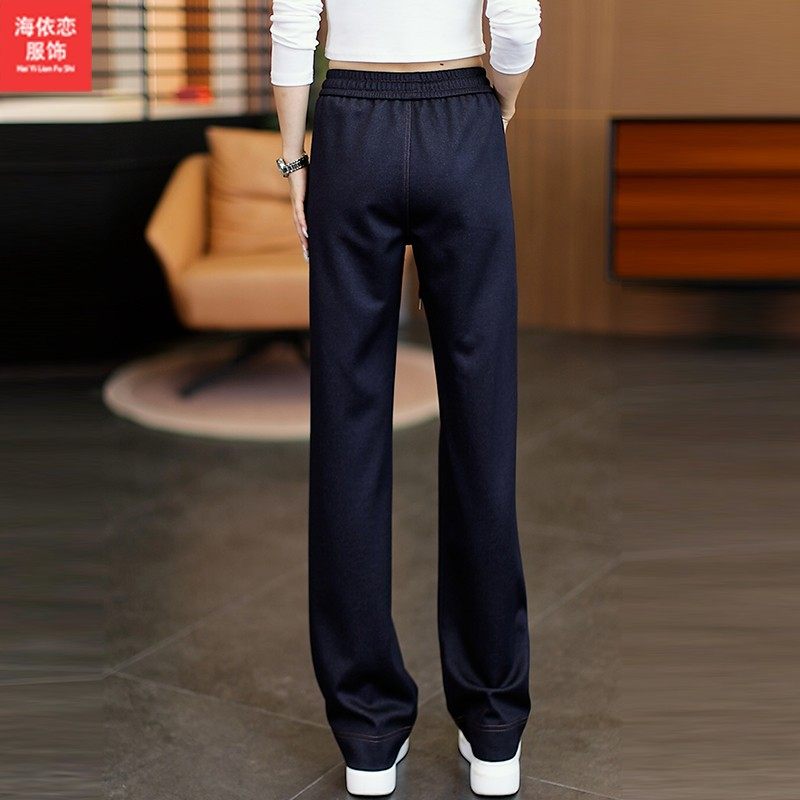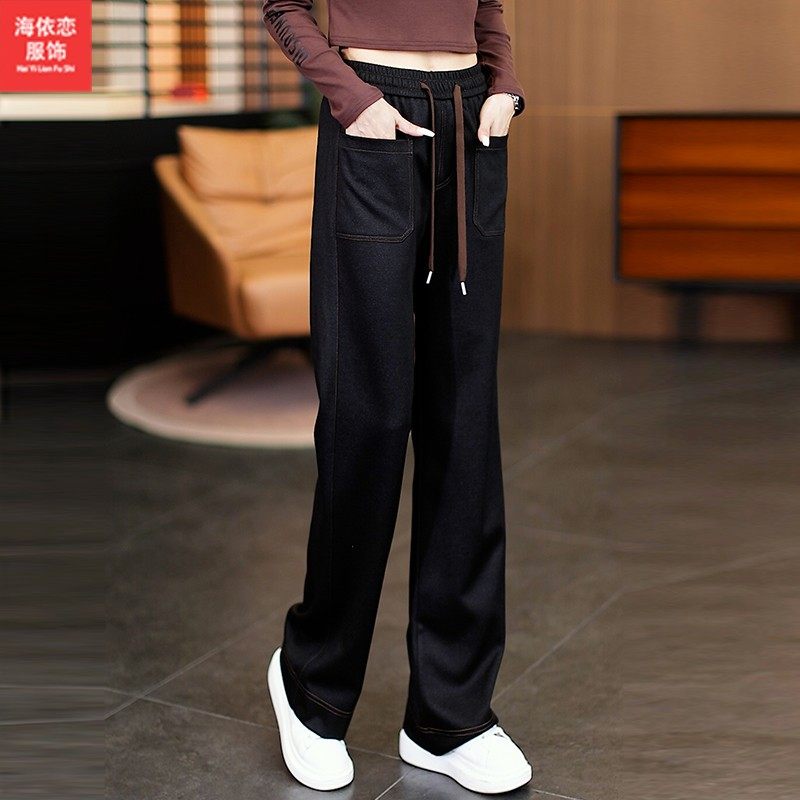 丹宁蓝2025春秋加绒窄版阔腿裤休闲裤防褪色抽绳垂感直筒牛仔裤女