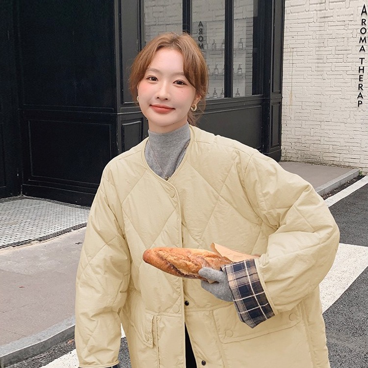圆领格子拼接羽绒棉服女2025年新款轻薄短款小个子宽松棉袄潮