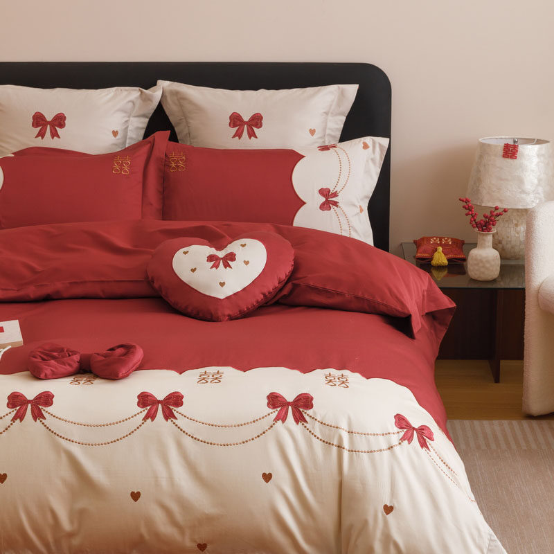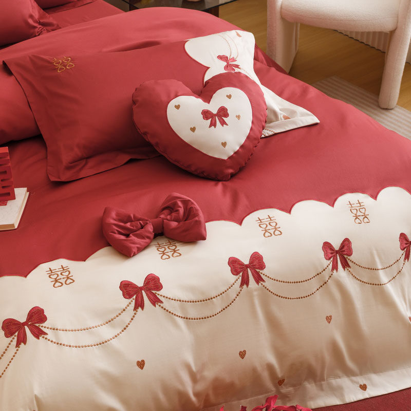 高端婚庆A类100全棉四件套大红色刺绣结婚纯棉新婚房陪嫁床上用品