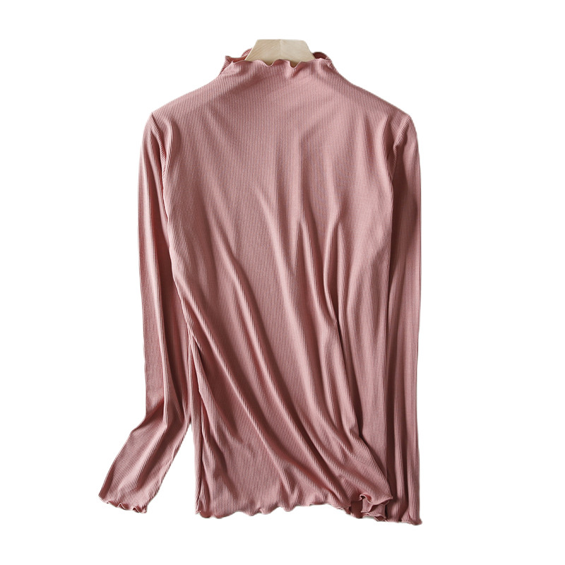 内搭半高领长袖薄款通勤打底衫纯色木耳边T恤宽松莫代尔女士上衣