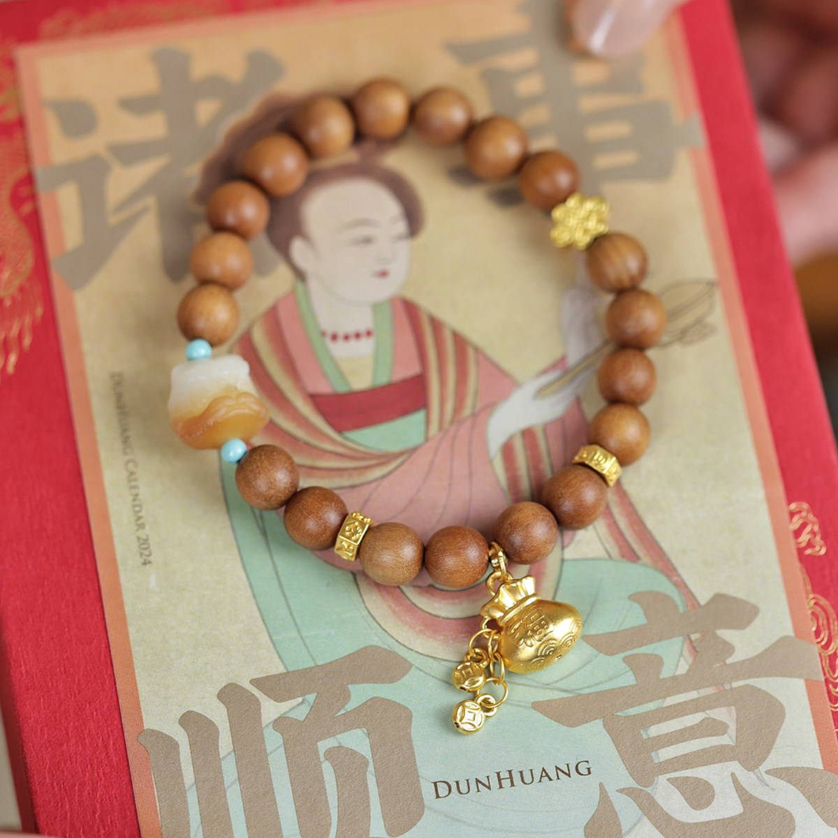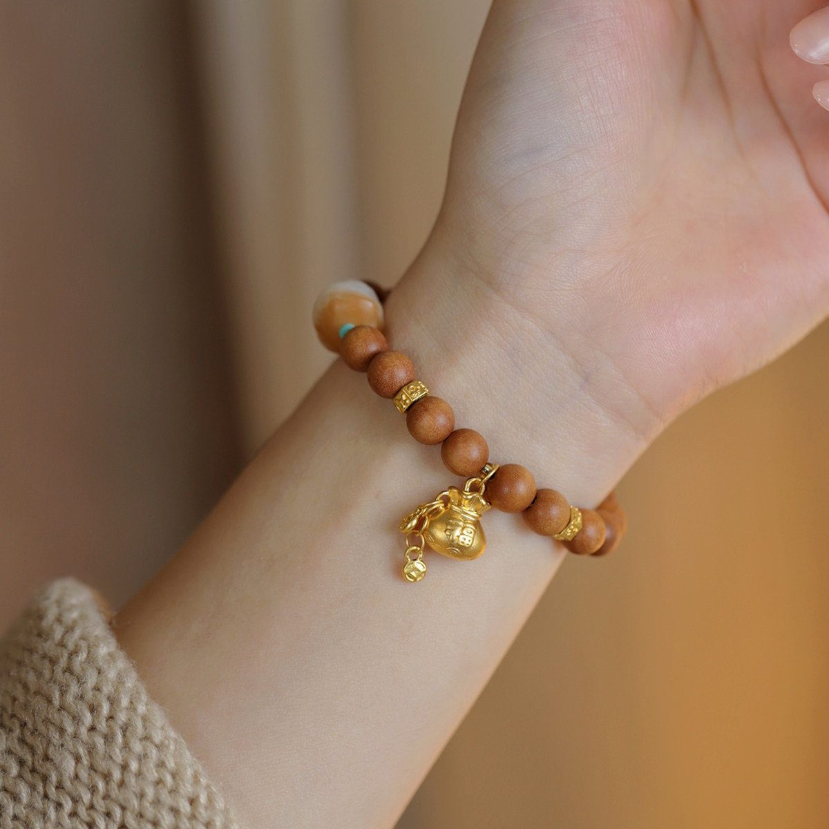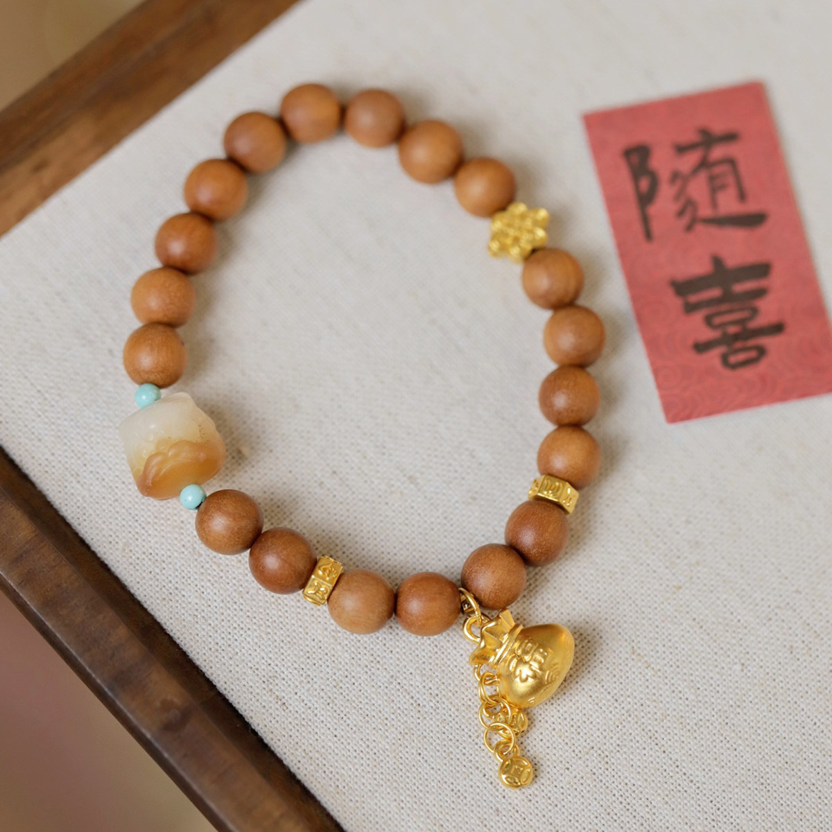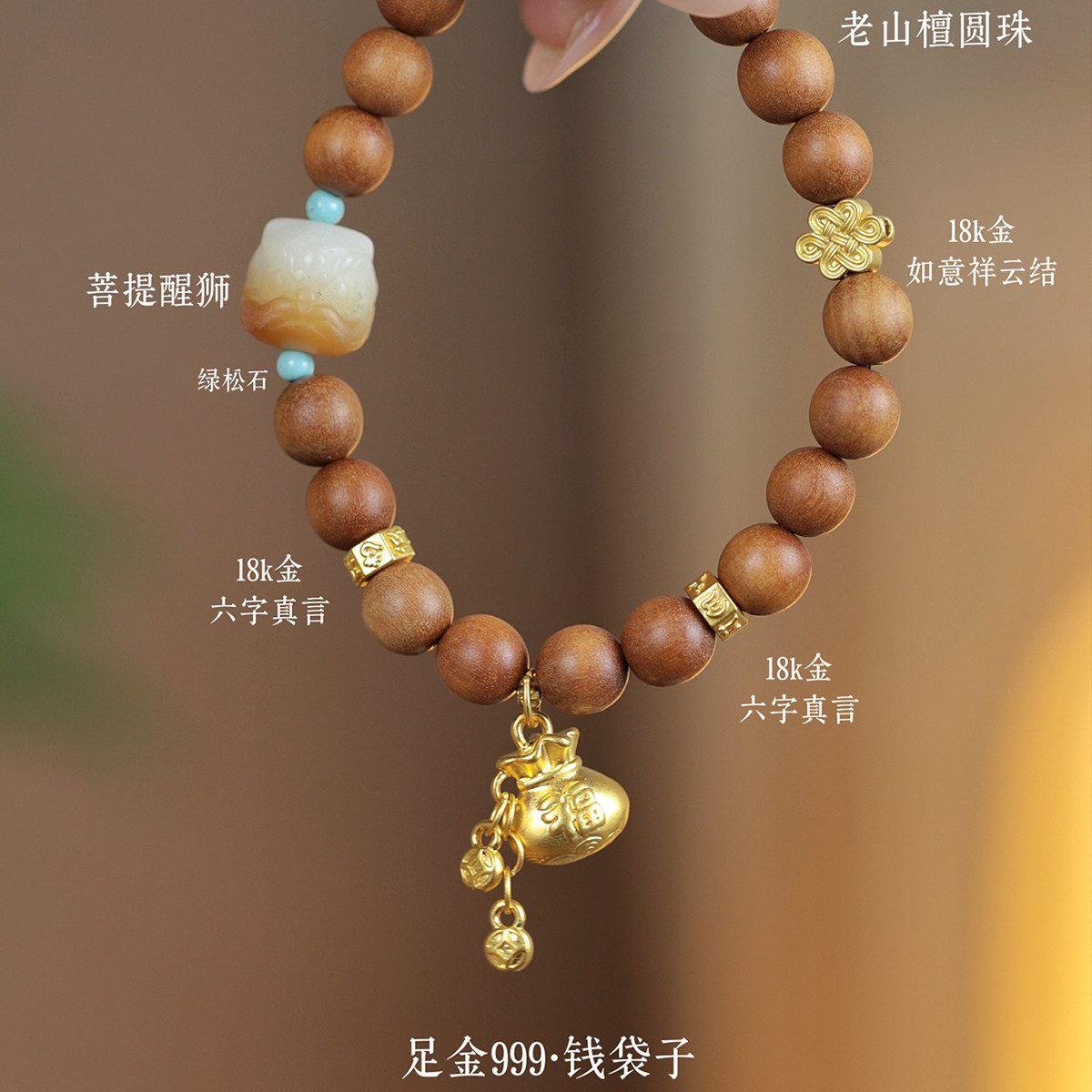 吉盟珠宝黄金钱袋子足金福袋手串18K金配件檀木佛珠手链女新中式