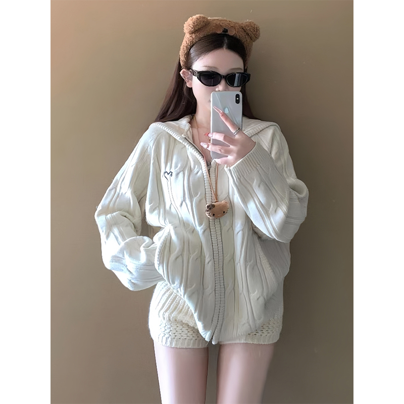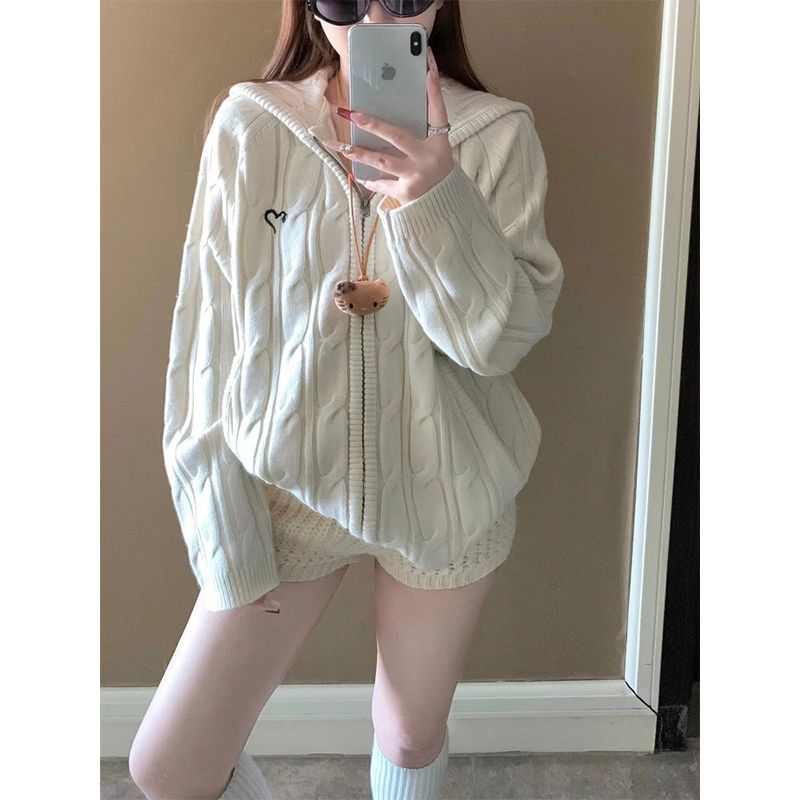 韩版宽松慵懒风松弛感洋气百搭长袖连帽拉链刺绣针织开衫毛衣女