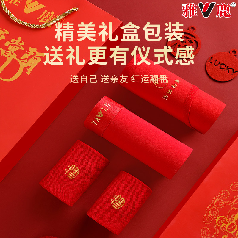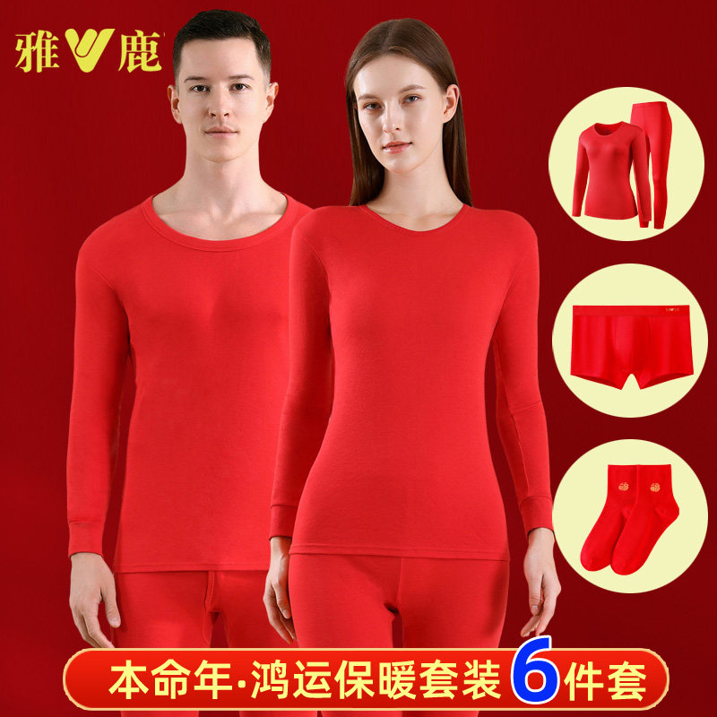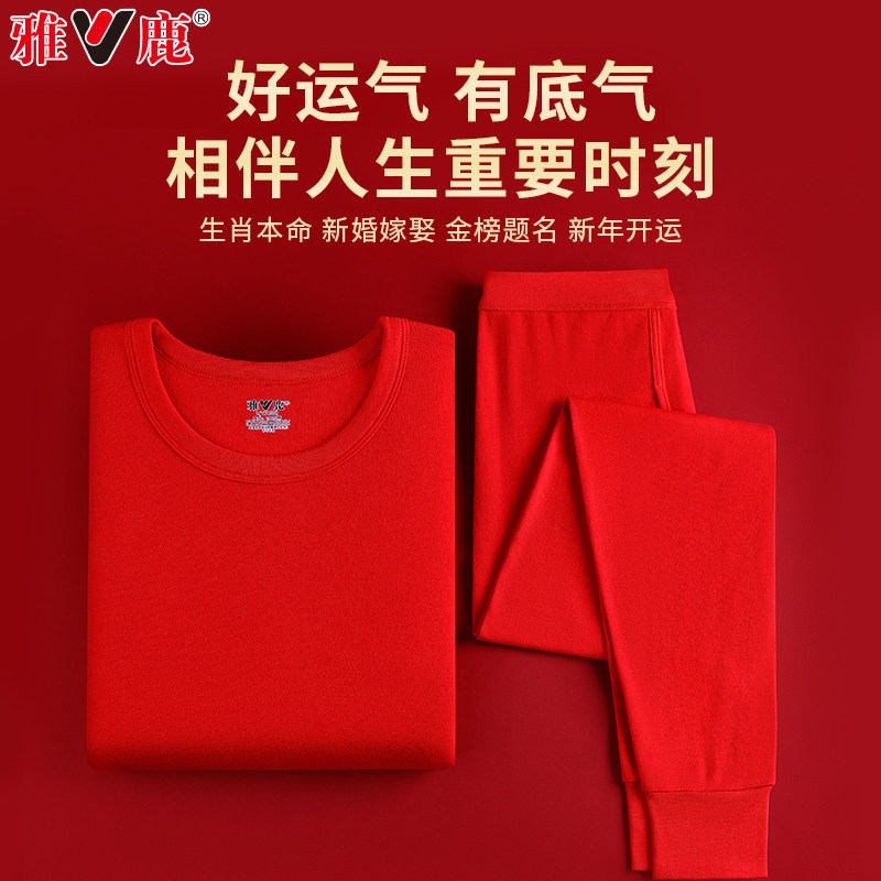雅鹿本命年保暖内衣套装男士红色纯棉秋衣秋裤女结婚马年加绒加厚