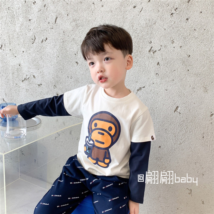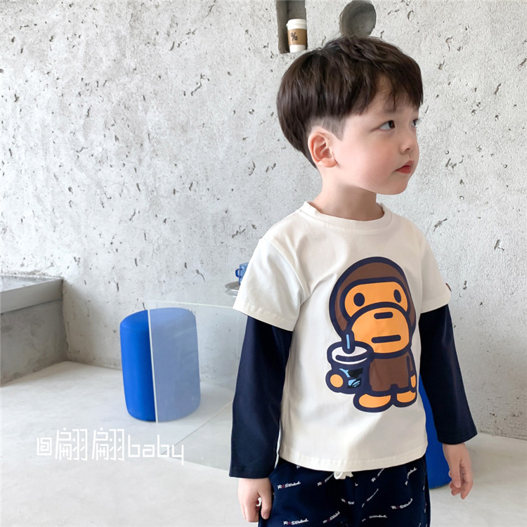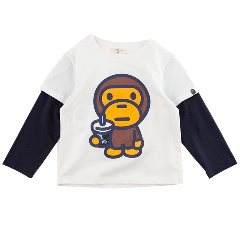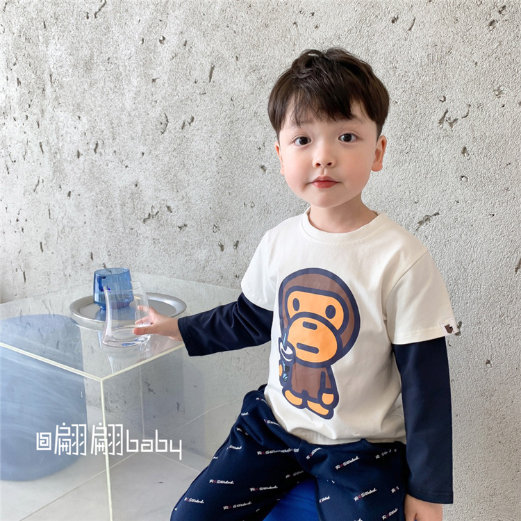 25春秋季新款日系潮男儿中童装卡通猴子字母纯棉假两件套长袖T恤