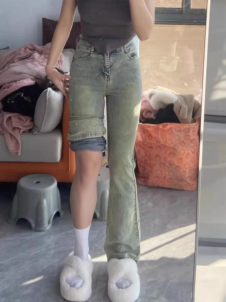 大码胖mm黄泥色高腰弹力牛仔裤女秋冬显瘦百搭微辣微喇叭马蹄裤子