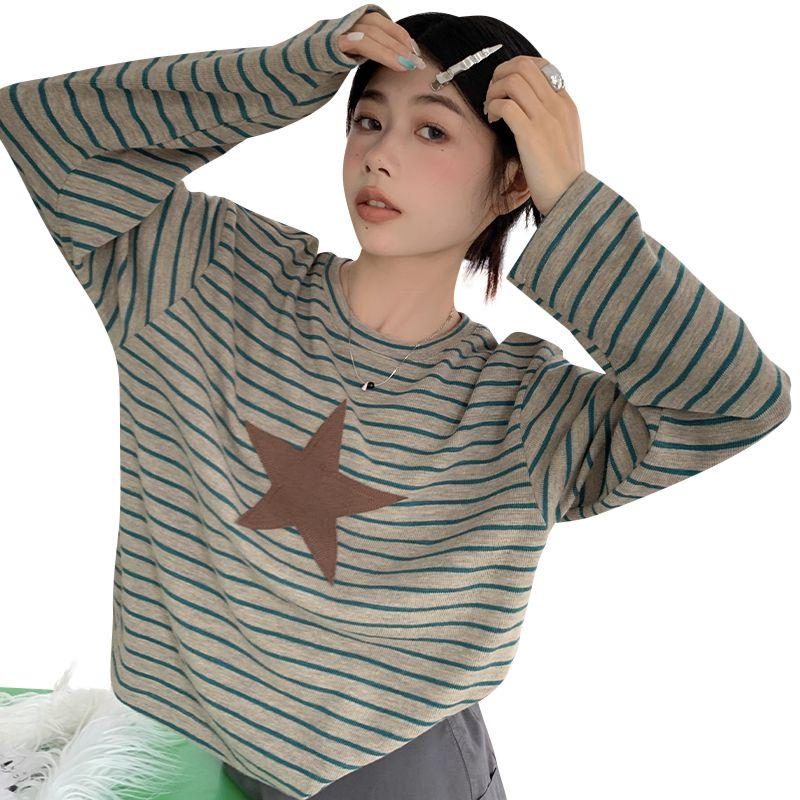 美式复古条纹长袖T恤女秋冬新款内搭打底衫小众宽松慵懒别致上衣