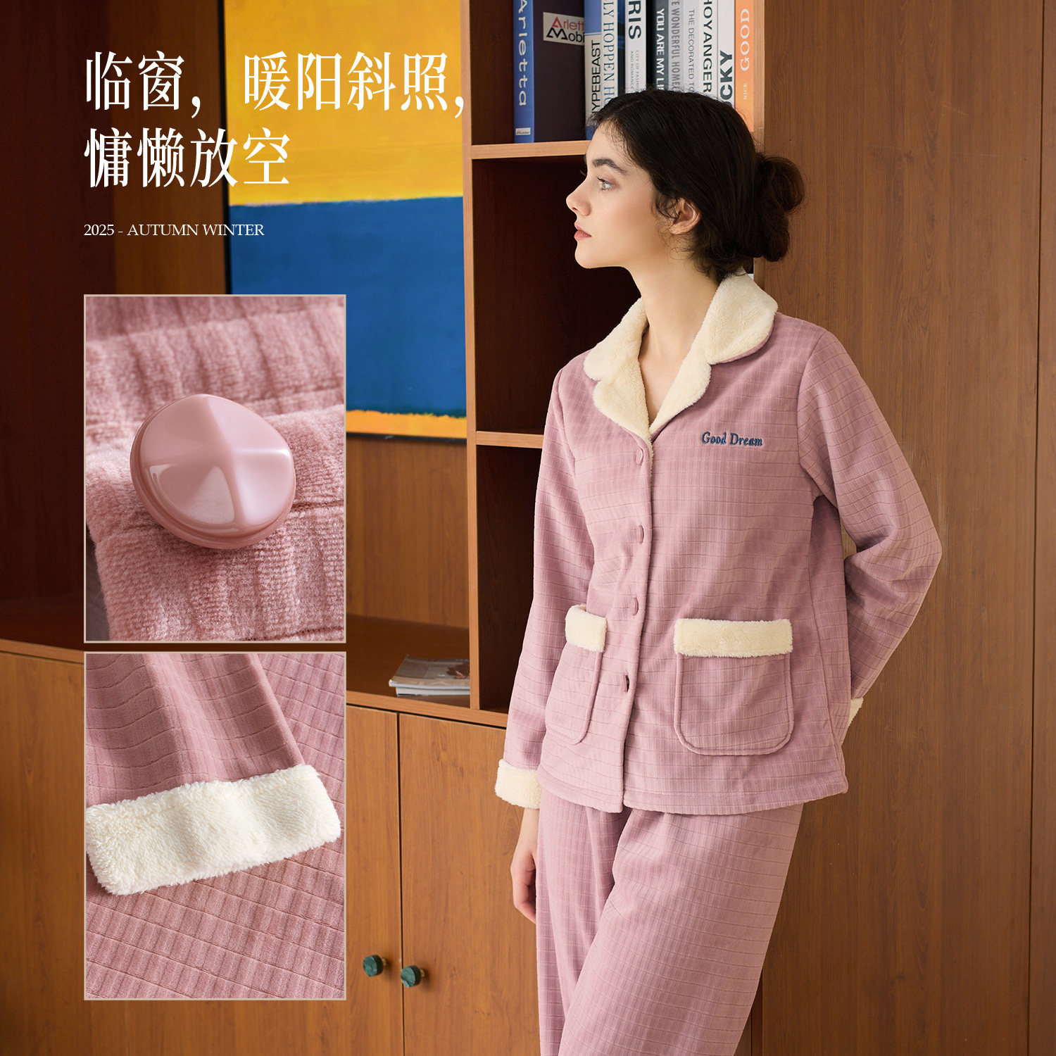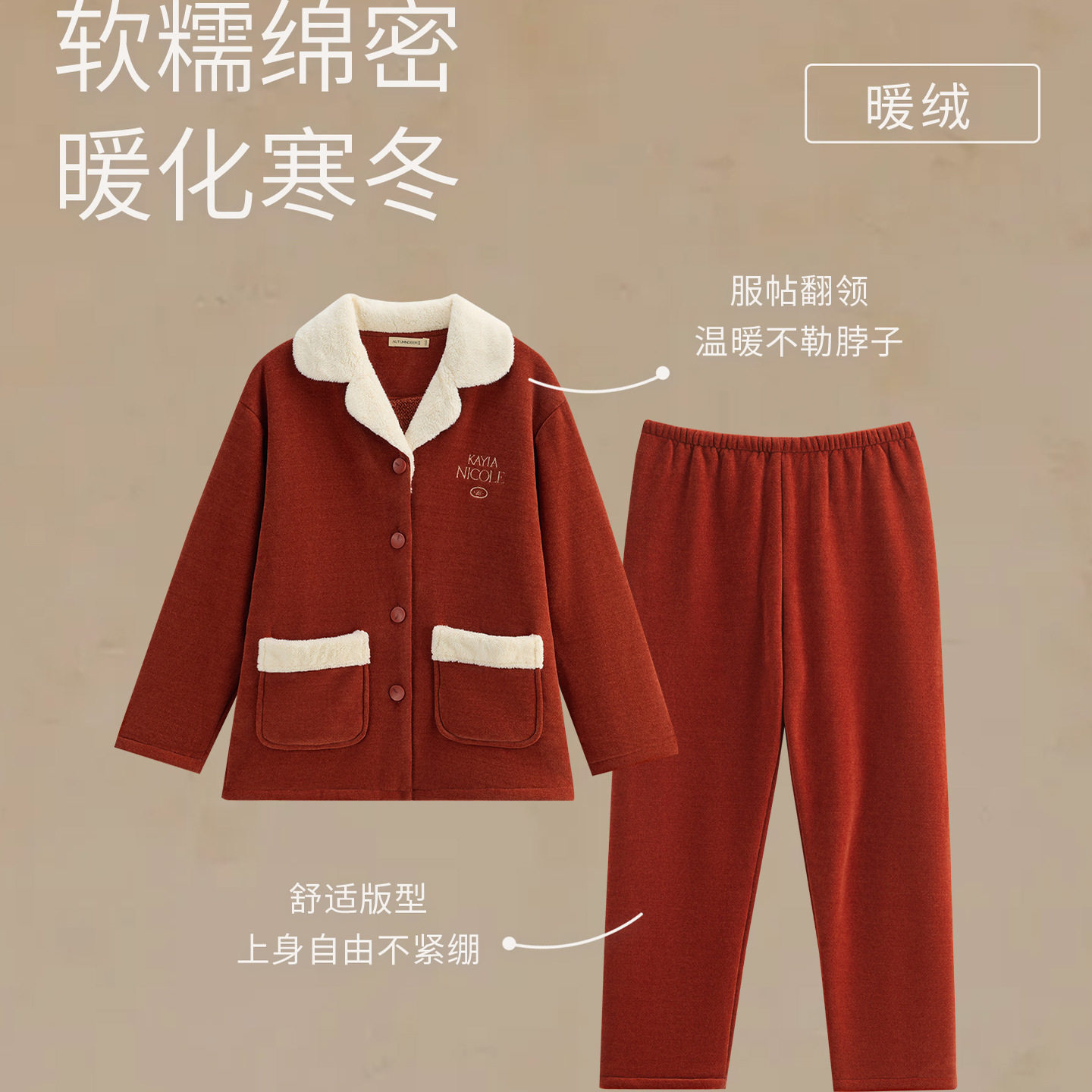 秋鹿复合绒睡衣女2025冬季保暖加厚珊瑚绒秋冬款天红色家居服套装