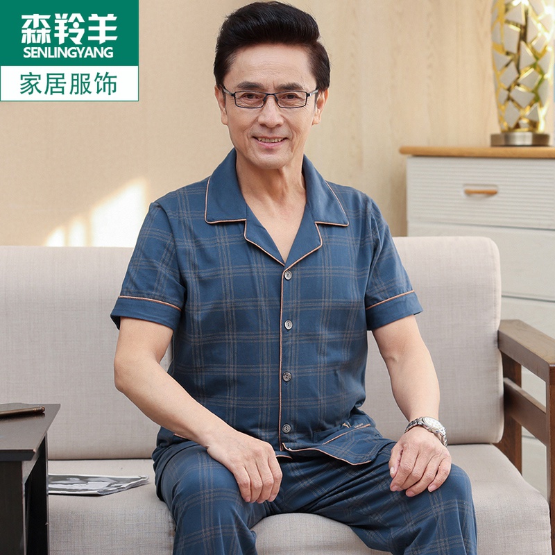 中老年爸爸老人男士睡衣短袖长裤纯棉夏季家居服薄款开衫夏天套装