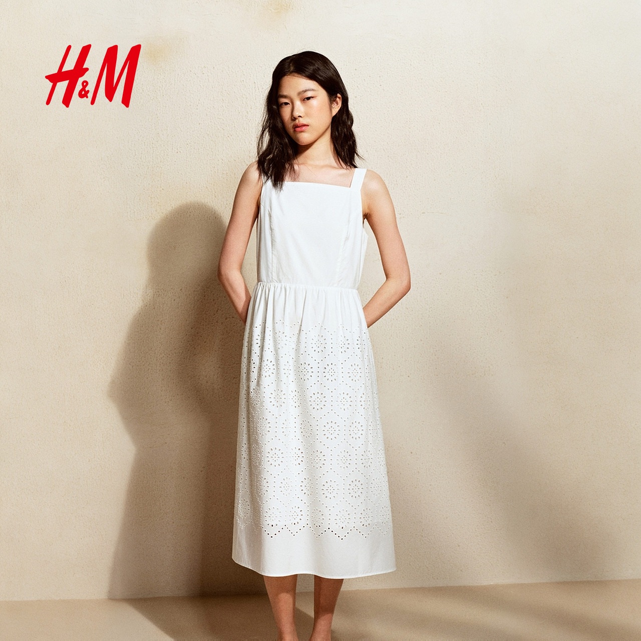 HM女装连衣裙2025夏季新款镂空刺绣吊带长裙肌理感连身裙1299431