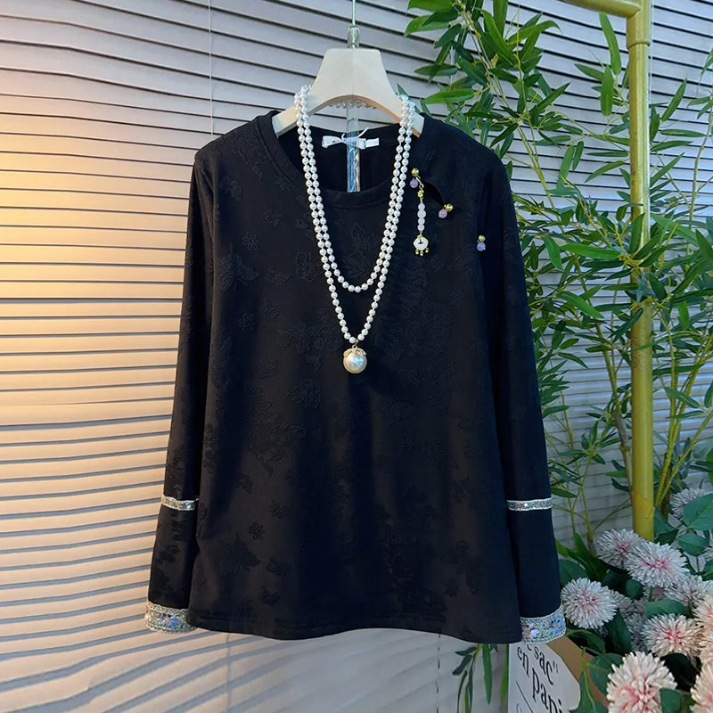 大码女装拼色袖口打底衫胖妹妹时尚气质显瘦立领盘扣花纹国风马甲