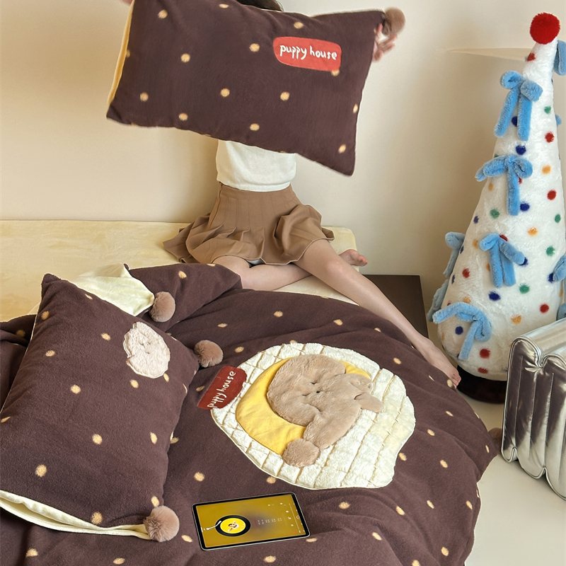 绵羊绒贴布绣咖色波点小狗四件套