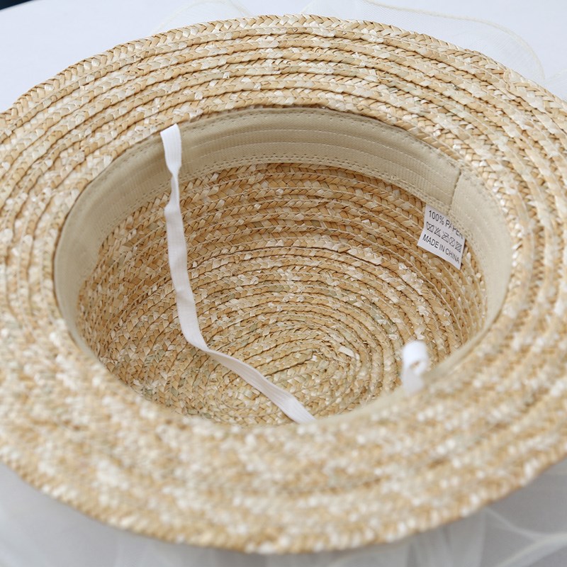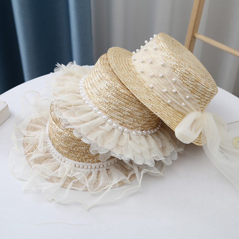 小清新儿童草帽珍珠蕾丝可爱女宝宝造型洋气平顶大沿凉帽遮阳帽