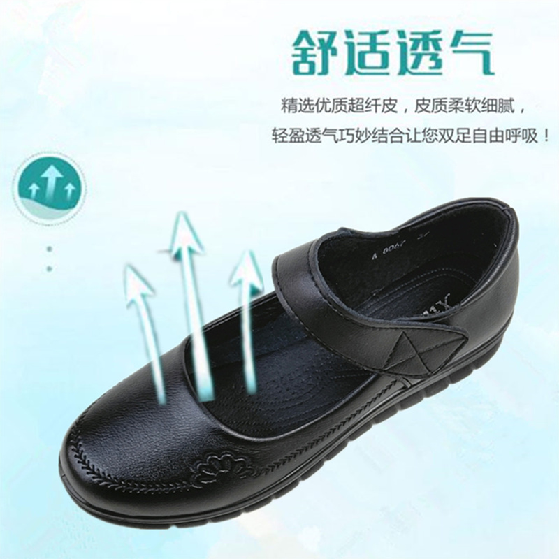平底工作鞋黑色浅口女鞋妈妈鞋子中老年单鞋软底魔术贴款老人皮鞋