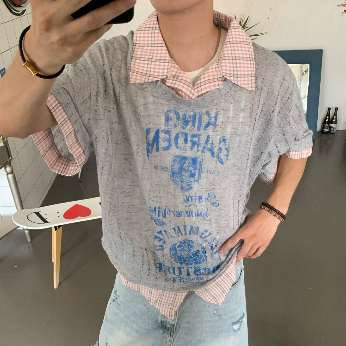 Holocene美式潮牌罩衫假两件短袖T恤夏季宽松衬衫翻领气质衬衣男