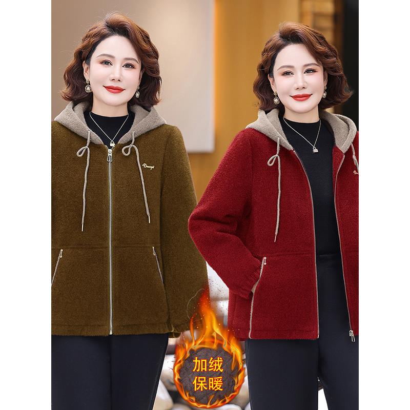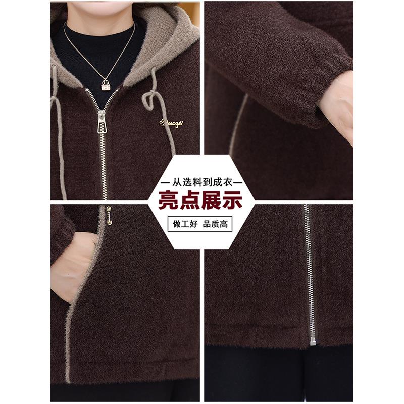 妈妈装秋冬水貂绒外套休闲毛呢上衣中老年女洋气加绒加厚连帽棉衣