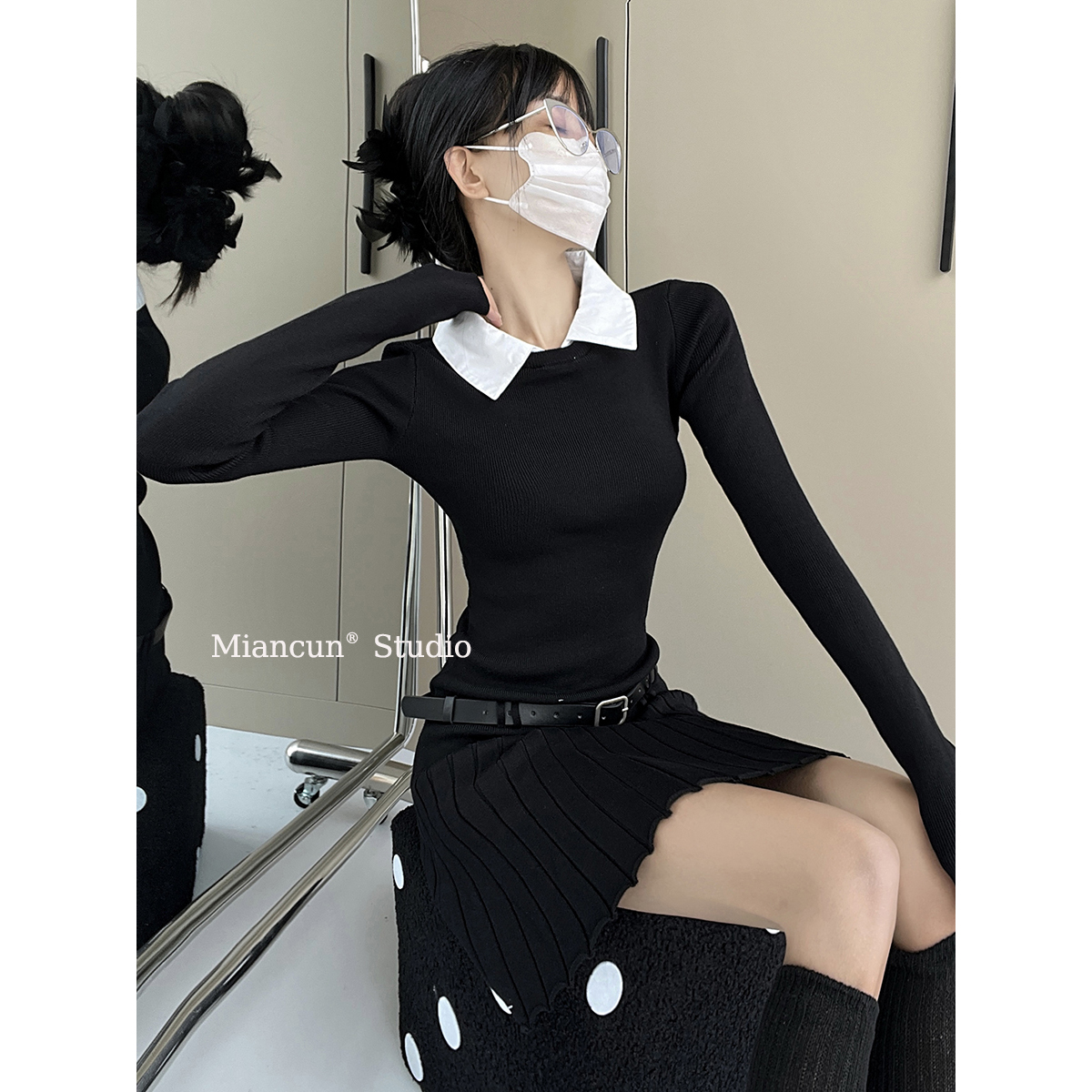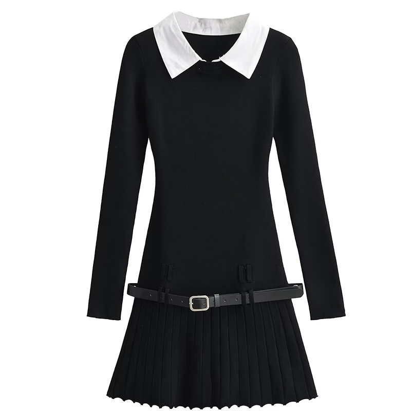 设计感假两件针织连衣裙女秋季新款内搭辣妹修身显瘦A字百褶短裙