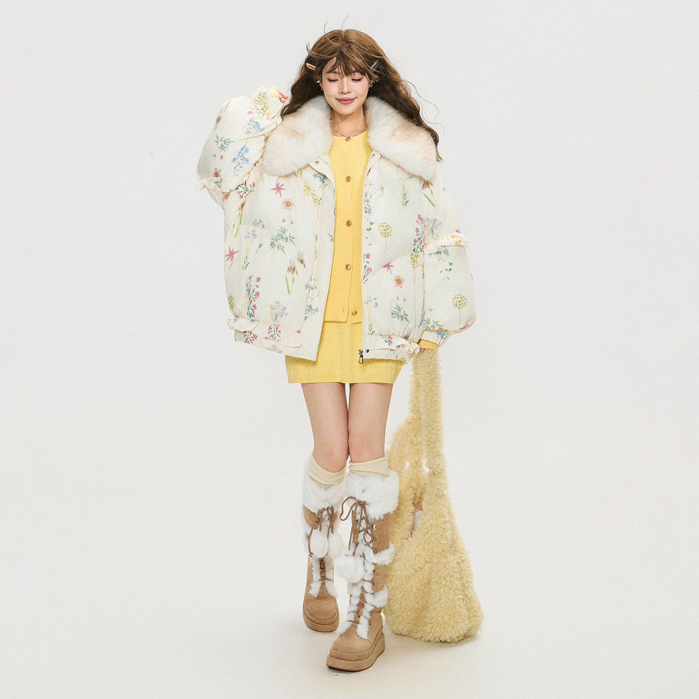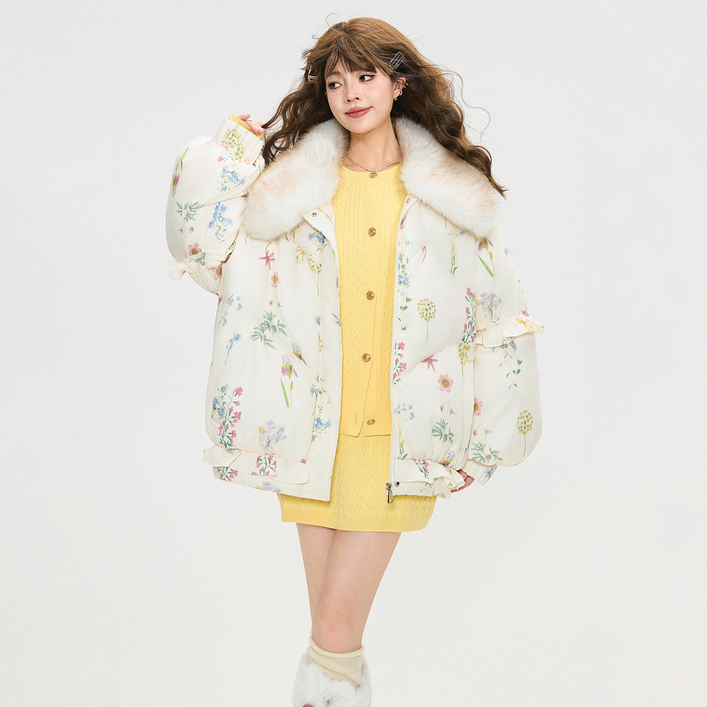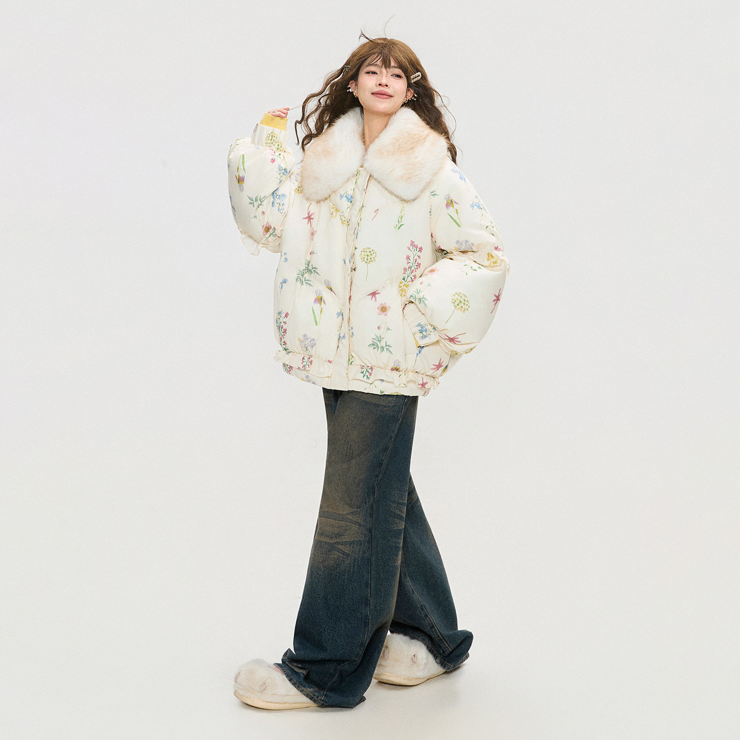 KEIKO 可卸环保狐狸毛领棉服外套冬季温柔感小碎花加厚保暖小棉袄