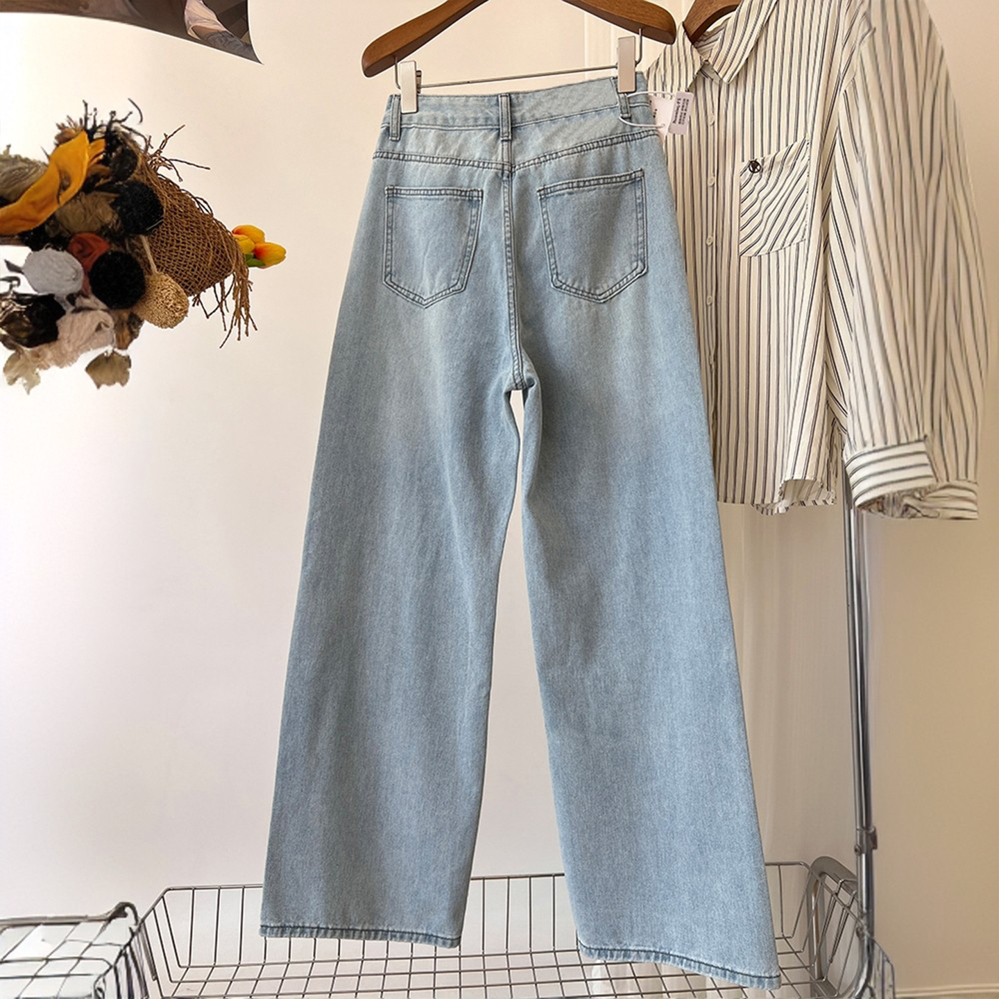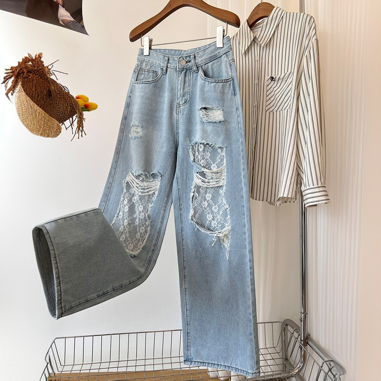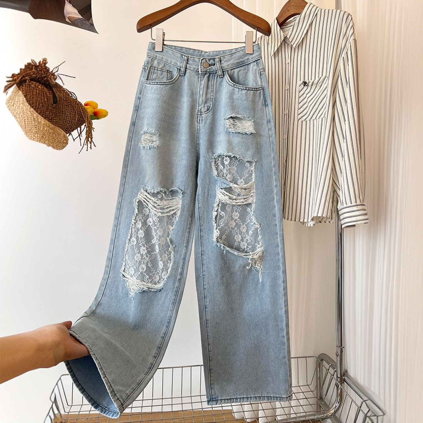 胖mm大码女装蕾丝破洞设计感阔腿牛仔裤高街vibe风遮肉显瘦裤子女
