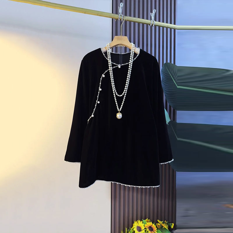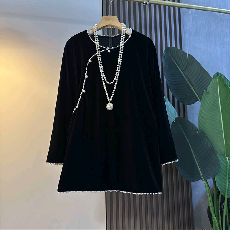 胖妹妹加肥圆领钉珠边长袖丝绒上衣宽松遮肚子大码女装秋季款小衫