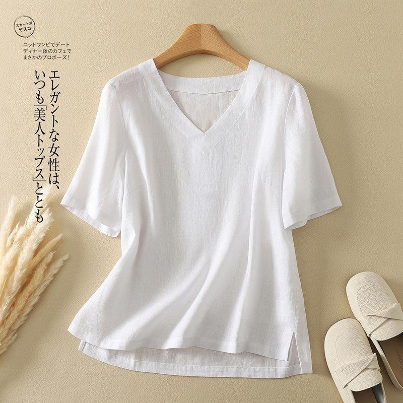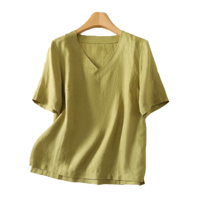 棉麻短袖t恤女夏季2025新款妈妈苎麻小衫大码宽松遮肚子亚麻上衣