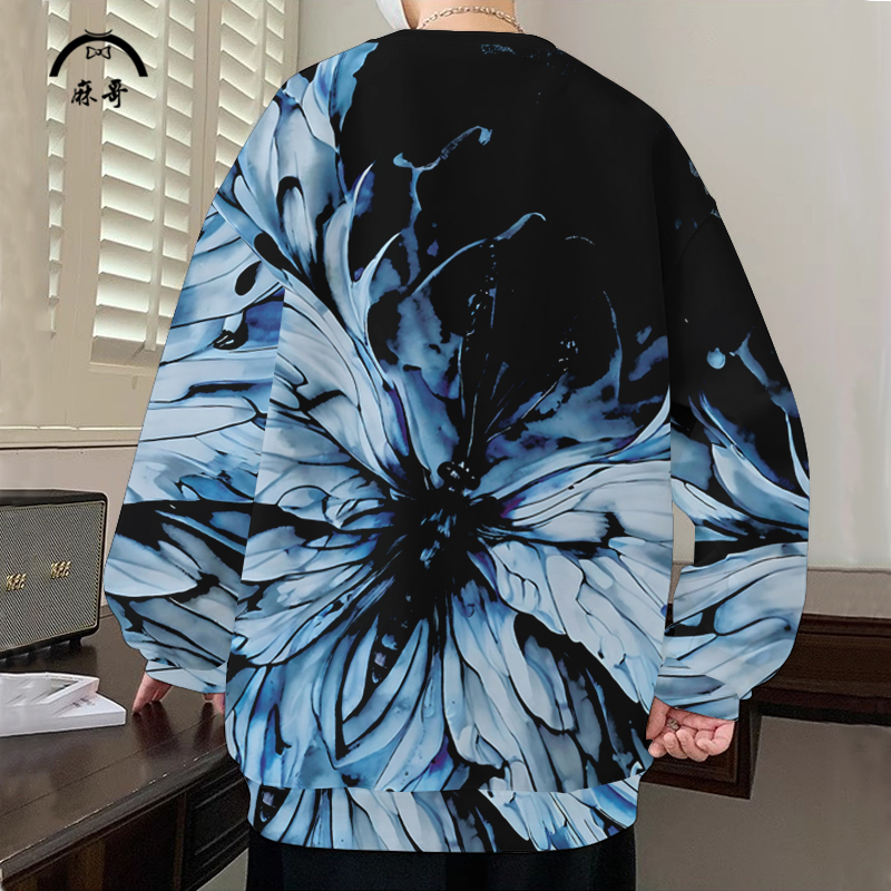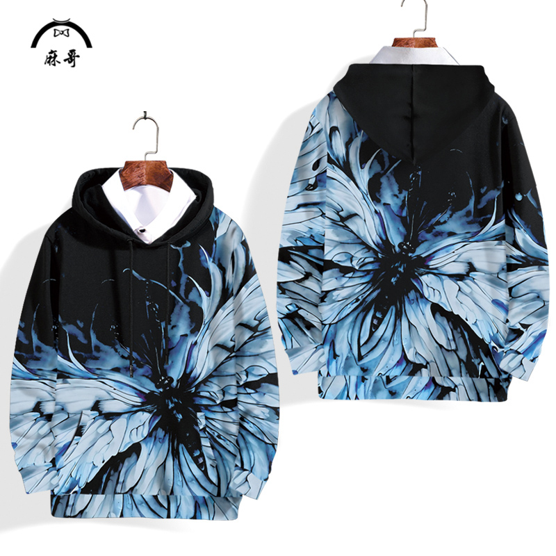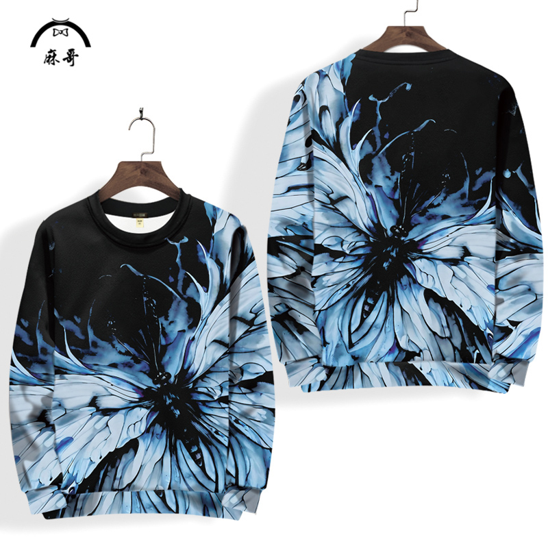 蝴蝶印花圆领卫衣男士秋冬新款长袖T恤大码加肥外套加绒加厚上衣