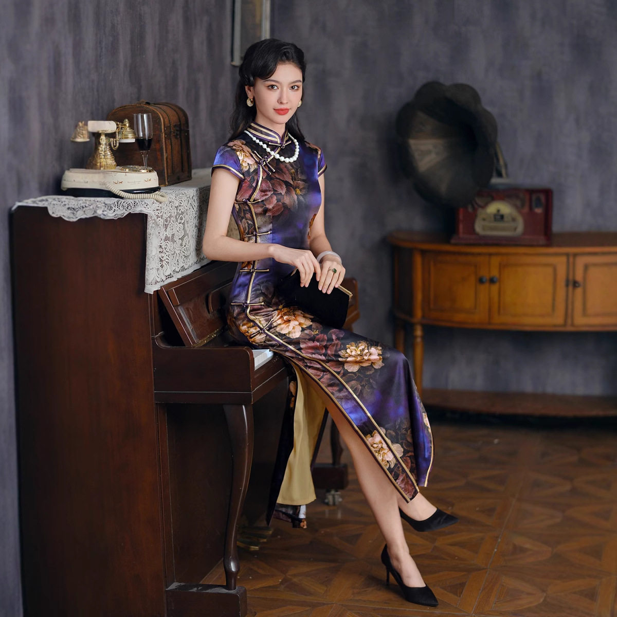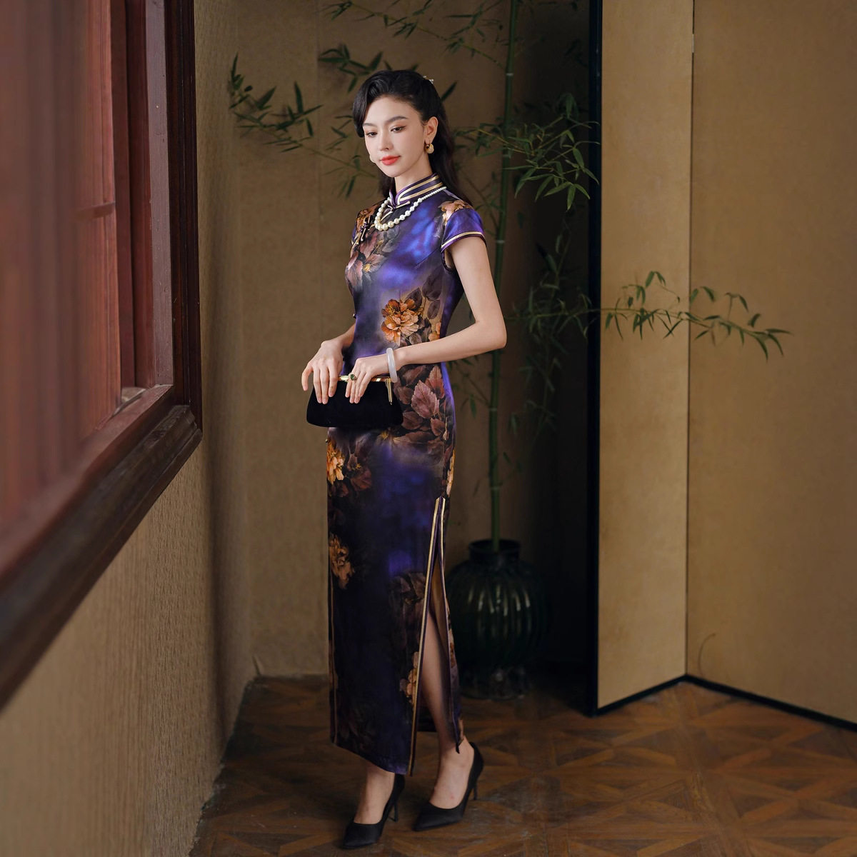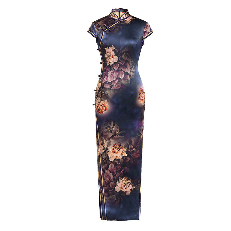 贵夫人紫色桑蚕丝真丝旗袍女中式高端喜婆婆礼服复古改良连衣裙潮